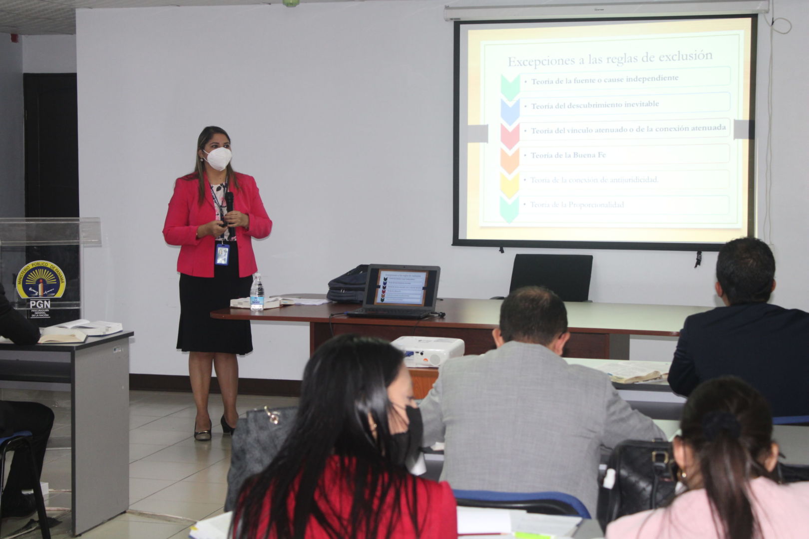 La fiscal de circuito, Elizabeth Carrión, de la Sección Segunda de Delitos Contra el Patrimonio, expuso los temas de Alegaciones Previas en las Audiencias de Fase Intermedia, quien compartió con los fiscales el tema de las Incompetencias, Nulidades. Impedimentos y Recusaciones. Por su parte la fiscal superior, Dayra Botello, de la Sección de Asistencia a Juicio de la Fiscalía Especializada de Familia, tocó el tema del Rol del Fiscal con énfasis en la Revelación de Evidencias y Objeciones a la Prueba.