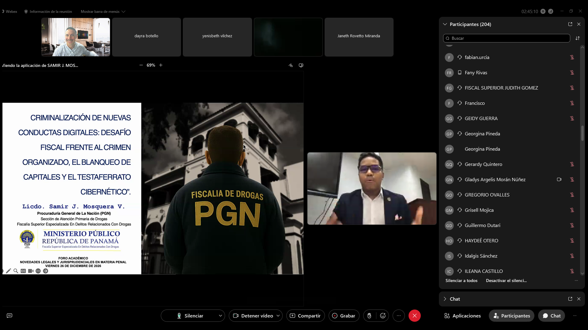 Seguidamente, la fiscal superior Janeth Rovetto desarrolló el tema del anticipo jurisdiccional probatorio en casos de delitos sexuales, destacando su relevancia para la preservación del testimonio y la prevención de la revictimización. A su vez, el licenciado Samir Mosquera presentó la ponencia sobre la criminalización de nuevas conductas digitales, enfocada en los retos del crimen organizado, el blanqueo de capitales y las estructuras delictivas transnacionales en entornos digitales.