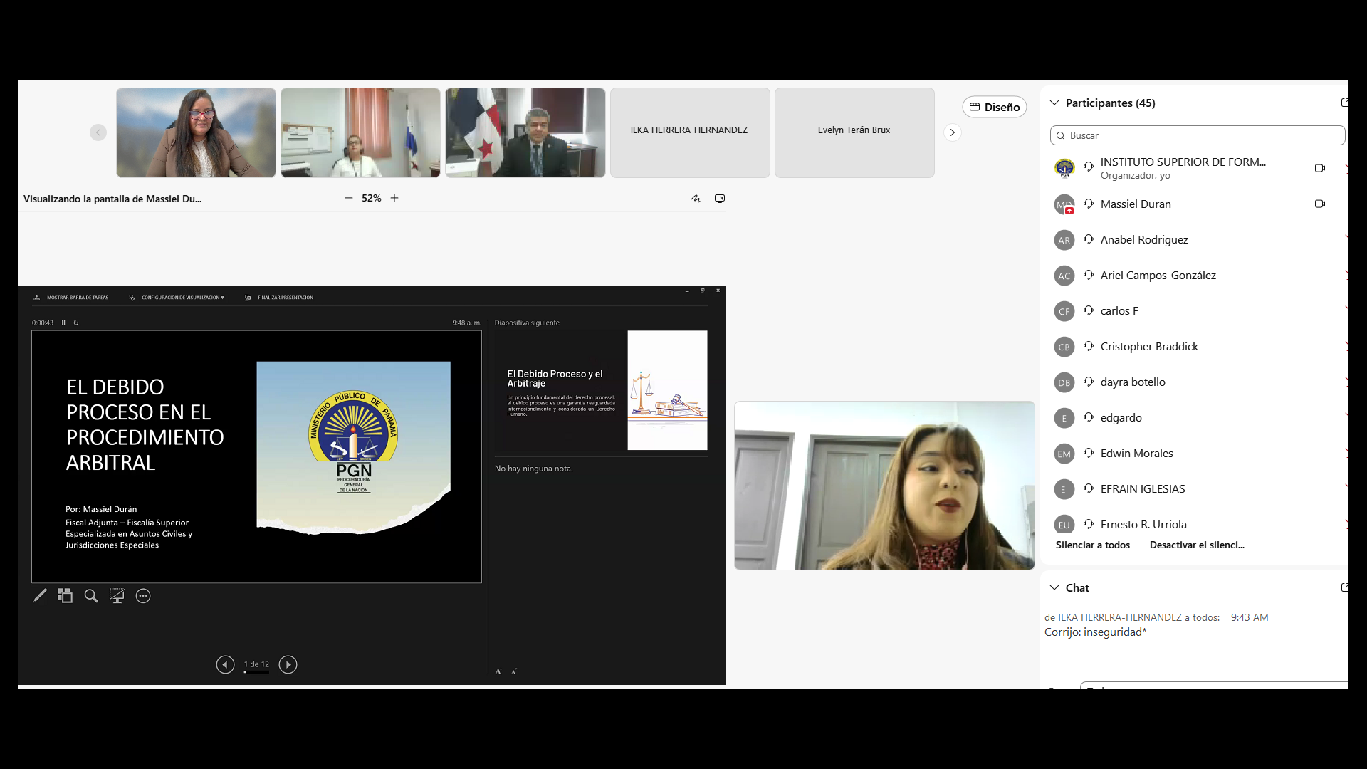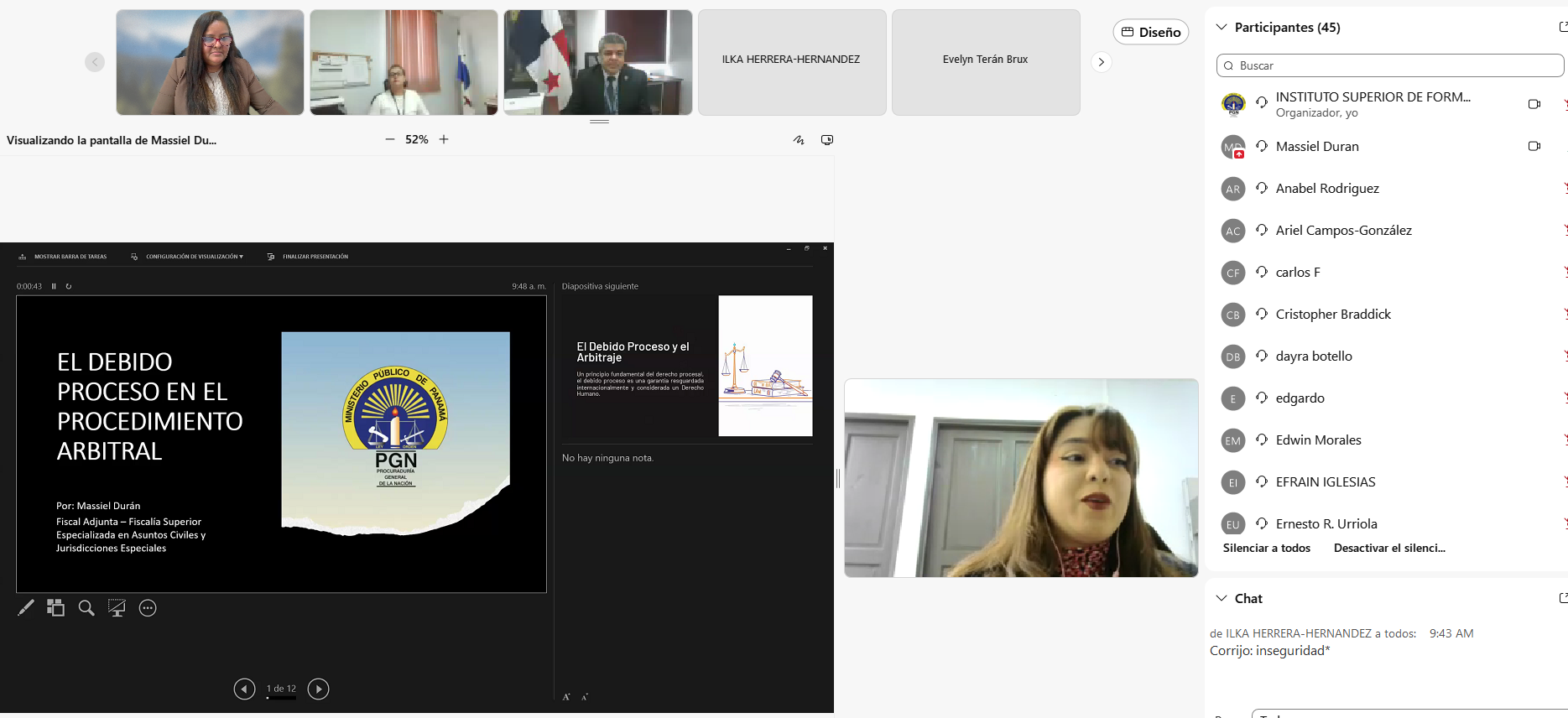 A continuación, la Fiscal Adjunta Massiel Durán desarrolló el tema “Debido proceso en el procedimiento arbitral”, destacando la relevancia de respetar las garantías procesales en los métodos alternos de solución de conflictos, como pilar para asegurar la seguridad jurídica.