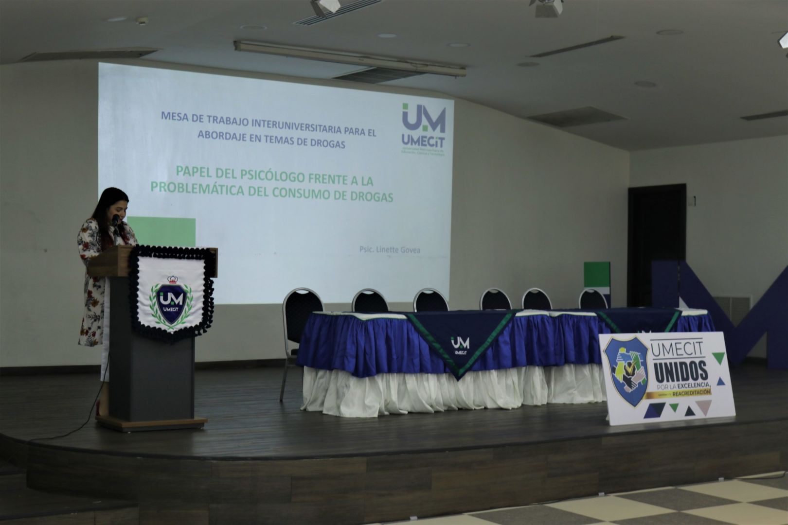 Se contó con las ponencias de la Licda. Lineth Govea, Coordinadora de la carrera de Psicología en UMECIT- Panamá, con el tema El papel del Psicólogo frente a la problemática del consumo de Drogas, y desde México el Dr. Jorge Villatoro, Director de Encuesta y análisis de datos del Instituto Nacional de Psiquiatría, con el tema Investigaciones en el uso de Drogas en Adolescentes Escolarizados.