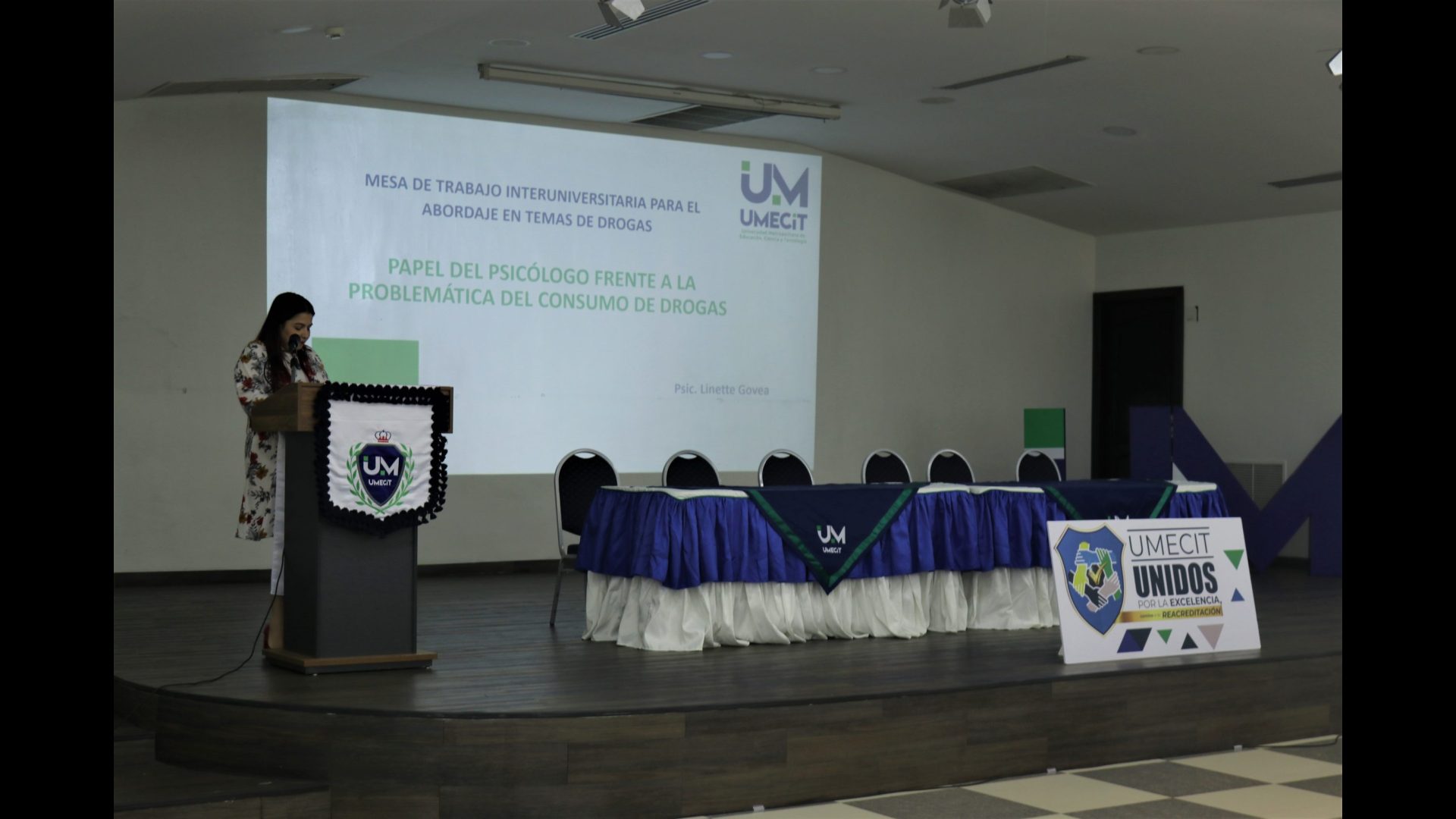 Se contó con las ponencias de la Licda. Lineth Govea, Coordinadora de la carrera de Psicología en UMECIT- Panamá, con el tema El papel del Psicólogo frente a la problemática del consumo de Drogas, y desde México el Dr. Jorge Villatoro, Director de Encuesta y análisis de datos del Instituto Nacional de Psiquiatría, con el tema Investigaciones en el uso de Drogas en Adolescentes Escolarizados.