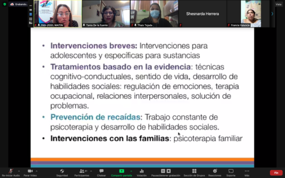 En dicho conversatorio intervino también la licenciada Tania De la Fuente, Psicóloga Social y Especialista en Prevención integral del Consumo de Drogas, de México.