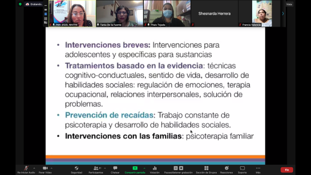 En dicho conversatorio intervino también la licenciada Tania De la Fuente, Psicóloga Social y Especialista en Prevención integral del Consumo de Drogas, de México.