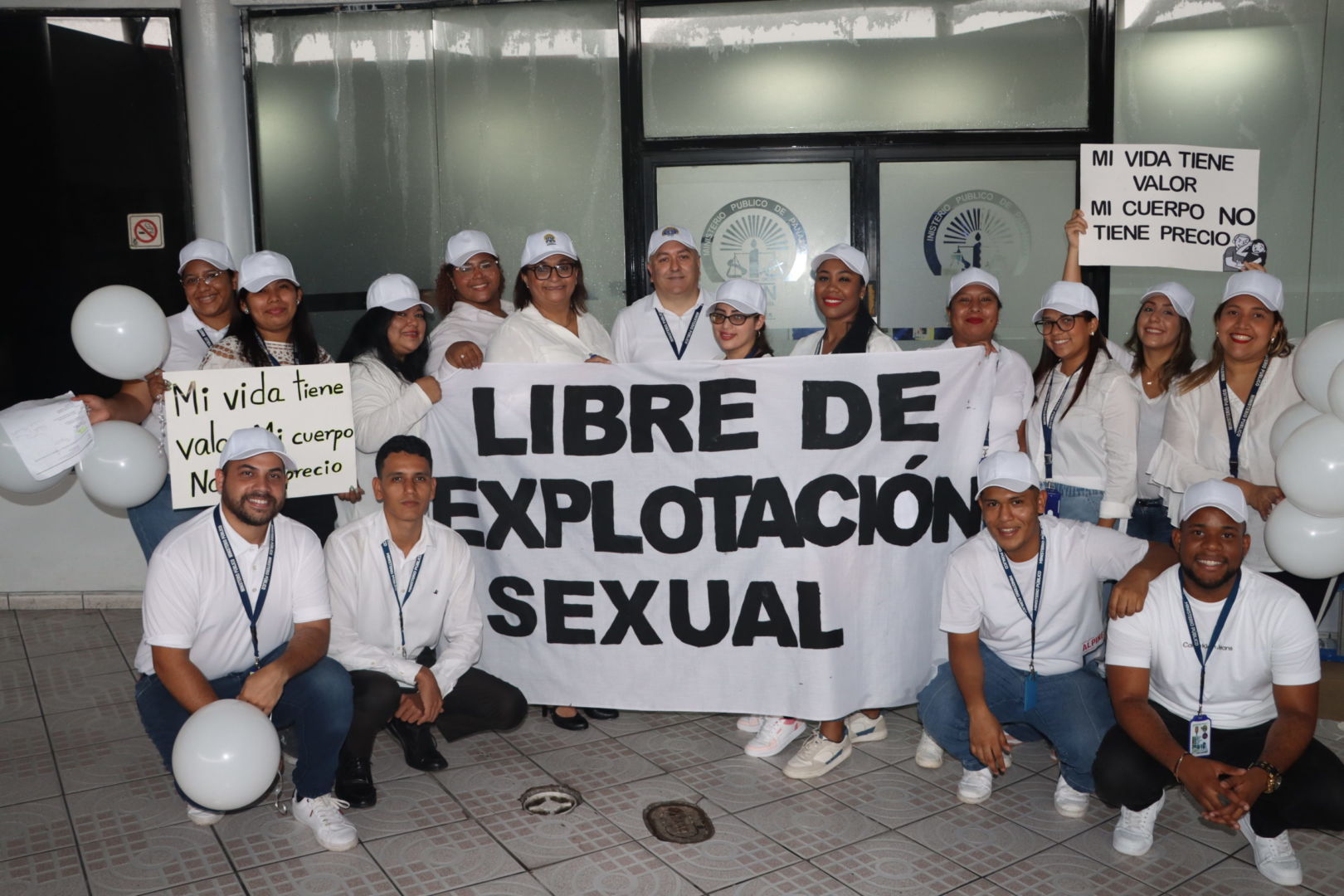 El fiscal Superior de San Miguelito, Humberto Rodríguez Batista acompañado de la fiscal de Circuito y Coordinadora de la Sección de delitos contra la Libertad e Integridad Sexual, Maribel Moreno y colaboradores de las diferentes secciones de la Fiscalía Regional de San Miguelito participaron este 30 de septiembre de 2024 una cadena humana, como parte del cierre de la campaña “Libre de Explotación Sexual”