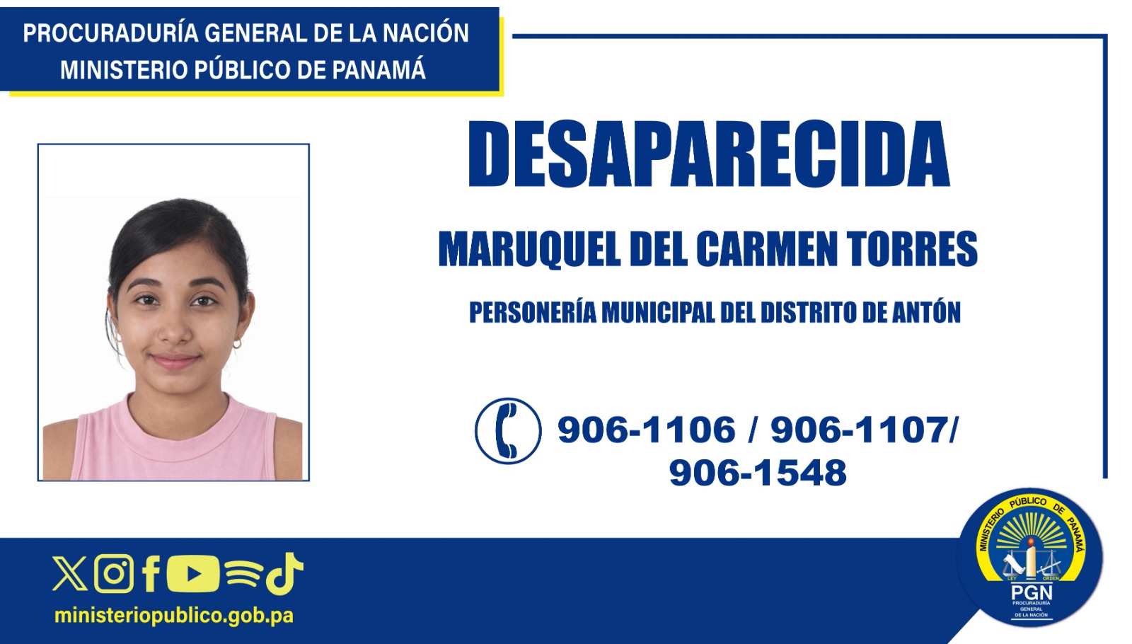 El Ministerio Público solicita la colaboración de la ciudadanía para que cualquier persona que tenga información que pueda contribuir a dar con el paradero de la ciudadana MARUQUEL DEL CARMEN TORRES se comunique de manera confidencial a los teléfonos 906-1106 o 906-1107, correspondientes a la Personería Municipal de Antón, o al teléfono 906-1548 de la Dirección de Investigación Judicial (DIJ) de Penonomé. Toda la información suministrada será manejada con absoluta reserva.