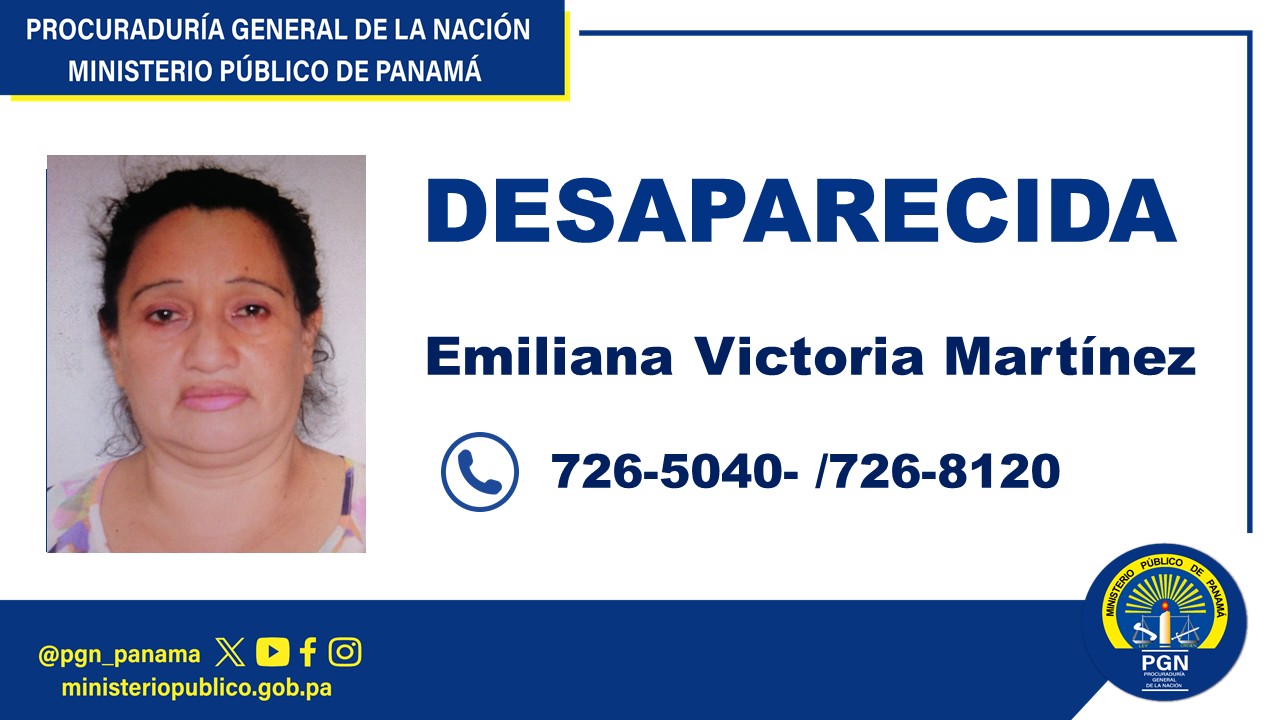 En Chiriquí, a través de la Personería de San Lorenzo, se mantiene investigación tras la desaparición de la ciudadana Emiliana Victoria Martínez de 53 años de edad.