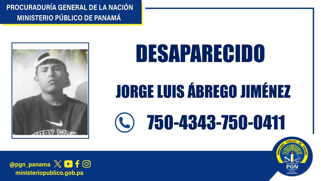 La Procuraduría General de la Nación, a través de la Sección de Atención Primaria de la Fiscalía Regional de Bocas del Toro, hace de conocimiento en general que inició investigación por la desaparición de José Luis Ábrego Jiménez, a quien sus familiares vieron por última vez el 7 de abril del 2025.