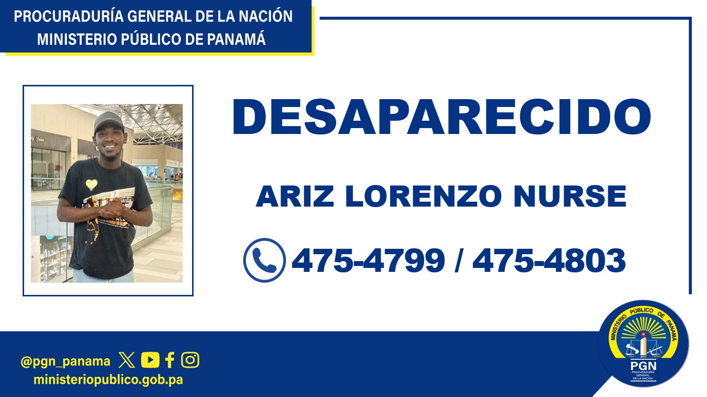 La Procuraduría General de la Nación a través de la Sección de Atención Primaria de la Fiscalía Regional de Colón y Guna Yala realiza esfuerzos para dar con la ubicación de Ariz Lorenzo Nurse Ceballos, de 21 años de edad, quien está desaparecido desde el 23 de julio del 2025.