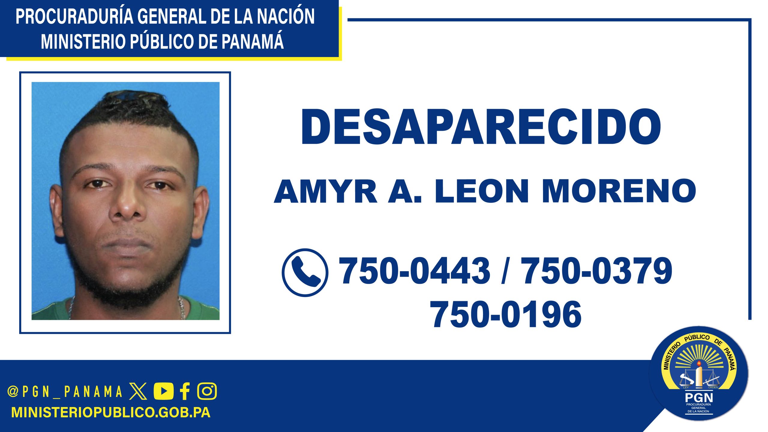La Procuraduría General de la Nación, a través de la Fiscalía Regional de Bocas del Toro, inició una investigación por la presunta comisión del delito, contra la vida e integridad personal, en perjuicio de Amyr Ali Leon Moreno de 38 años de edad, con cedula de identidad personal 4-740-368, quien fue visto por última vez, en el mes de mayo de 2024.