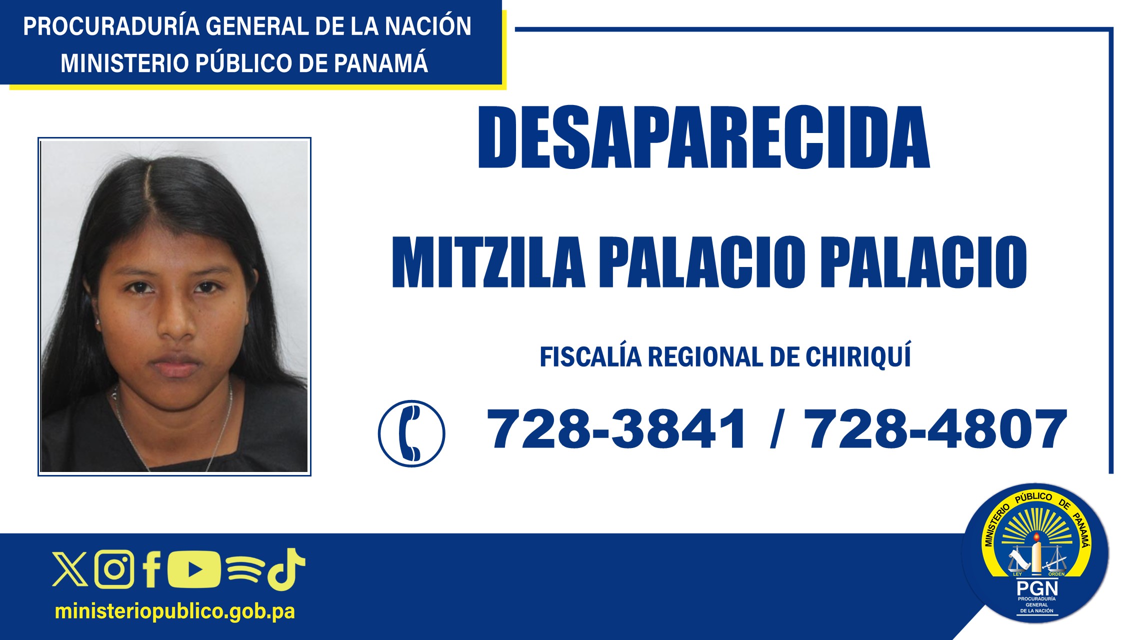 La Sección de delitos contra la vida y la integridad personal, de la Fiscalía Regional de Chiriquí, mantiene investigación tras la desaparición de la ciudadana Mitzila Palacio Palacio, con cédula de identidad personal 12-732-591, nacida el 8 de marzo de 2006, de 19 años de edad.