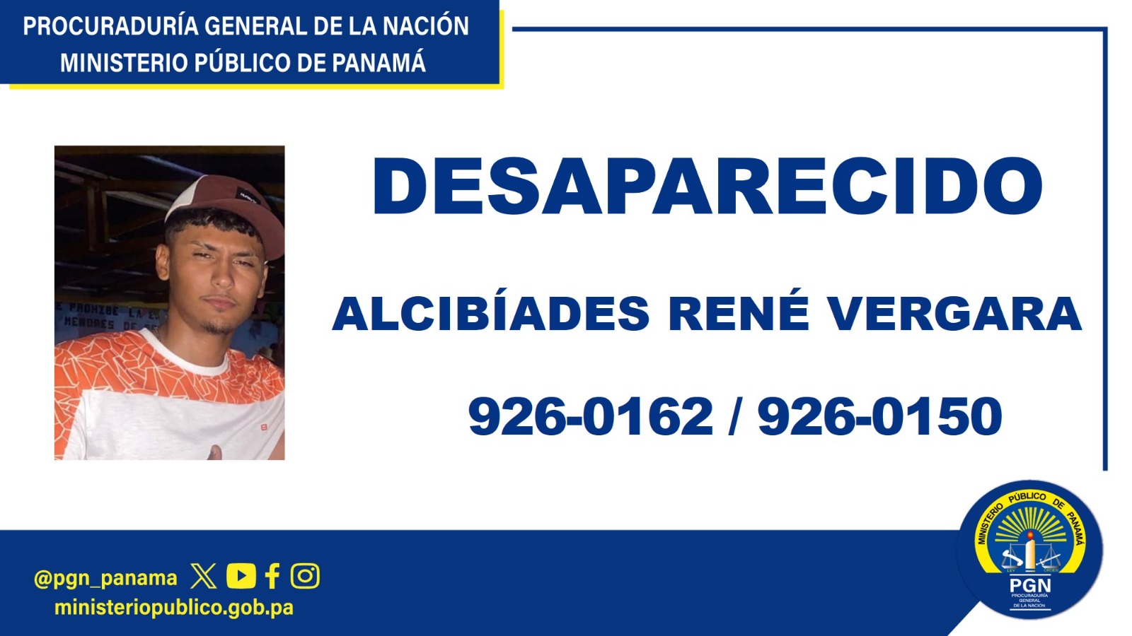 La Procuraduría General de la Nación, a través de la Sección de Atención Primaria de la Fiscalía Regional de Los Santos realiza esfuerzos para dar con la ubicación de Alcibíades René Vergara Villarreal con cédula 7-714 -1016, de 21 años de edad, quien está desaparecido desde el 18 de julio del 2025.