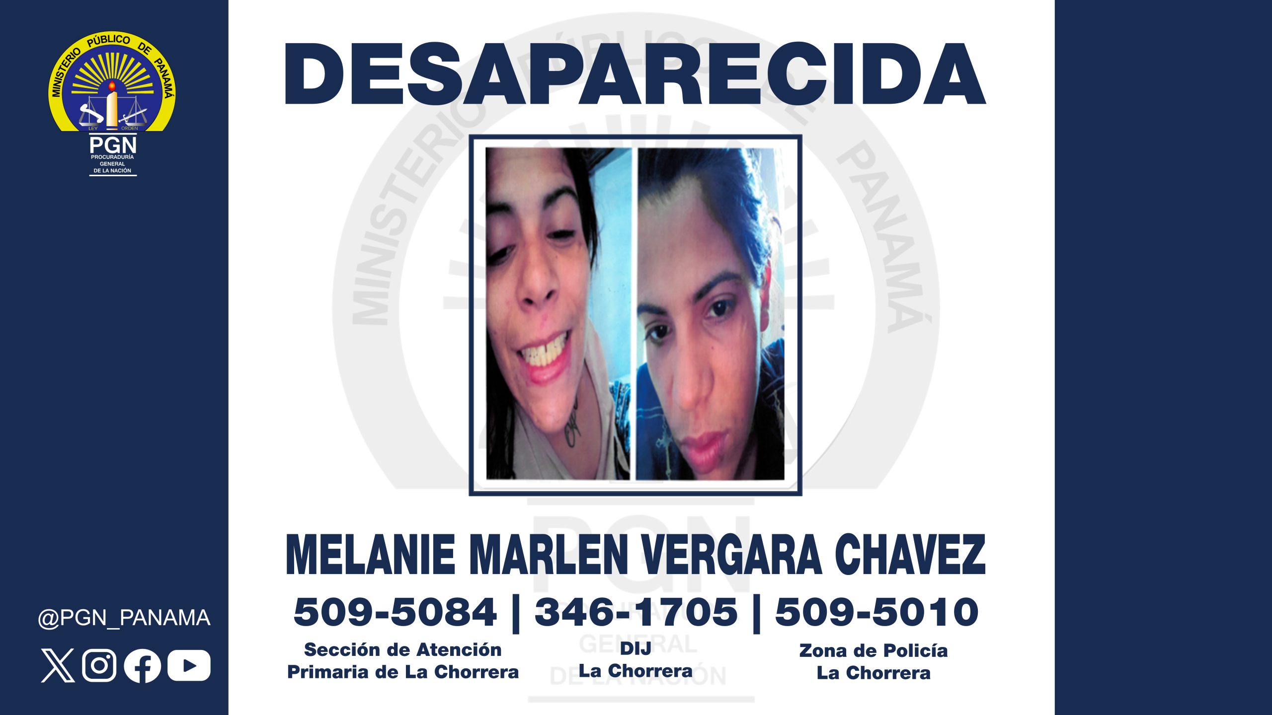 La Fiscalía Regional de Panamá Oeste, a través de la Sección de Atención Primaria de La Chorrera hace de conocimiento en general que se instruye un sumario en averiguación por la supuesta comisión del delito contra la vida e integridad personal, por la desaparición de Melanie Marlen Vergara Chávez de 23 años de edad.