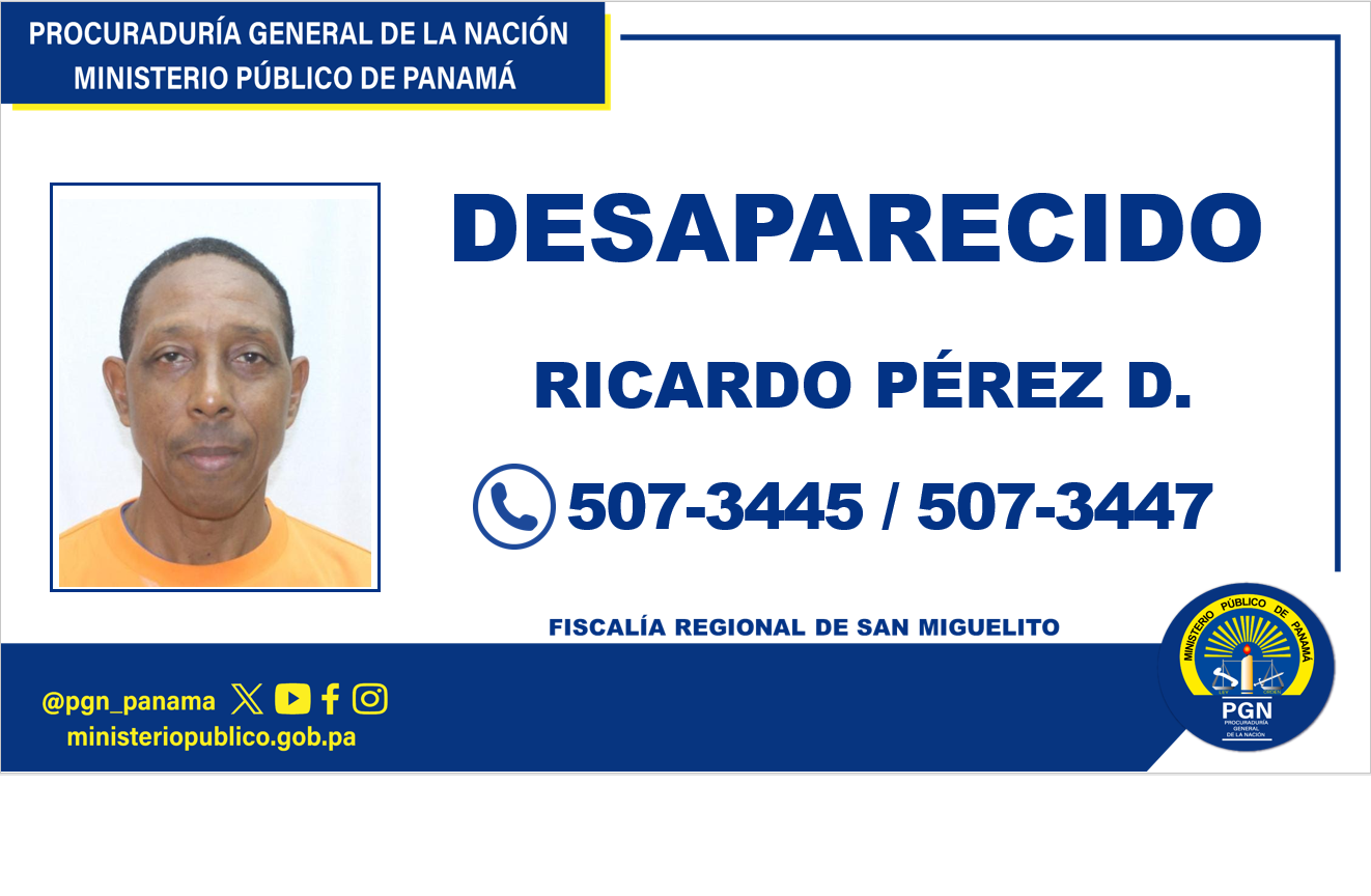 Se solicita a la ciudadanía que de tener conocimiento del paradero de Ricardo Pérez Domínguez por favor comunicarse a los teléfonos 507-3445 o 507-2447 de la Sección de Atención Primaria de la Fiscalía Regional de San Miguelito.
