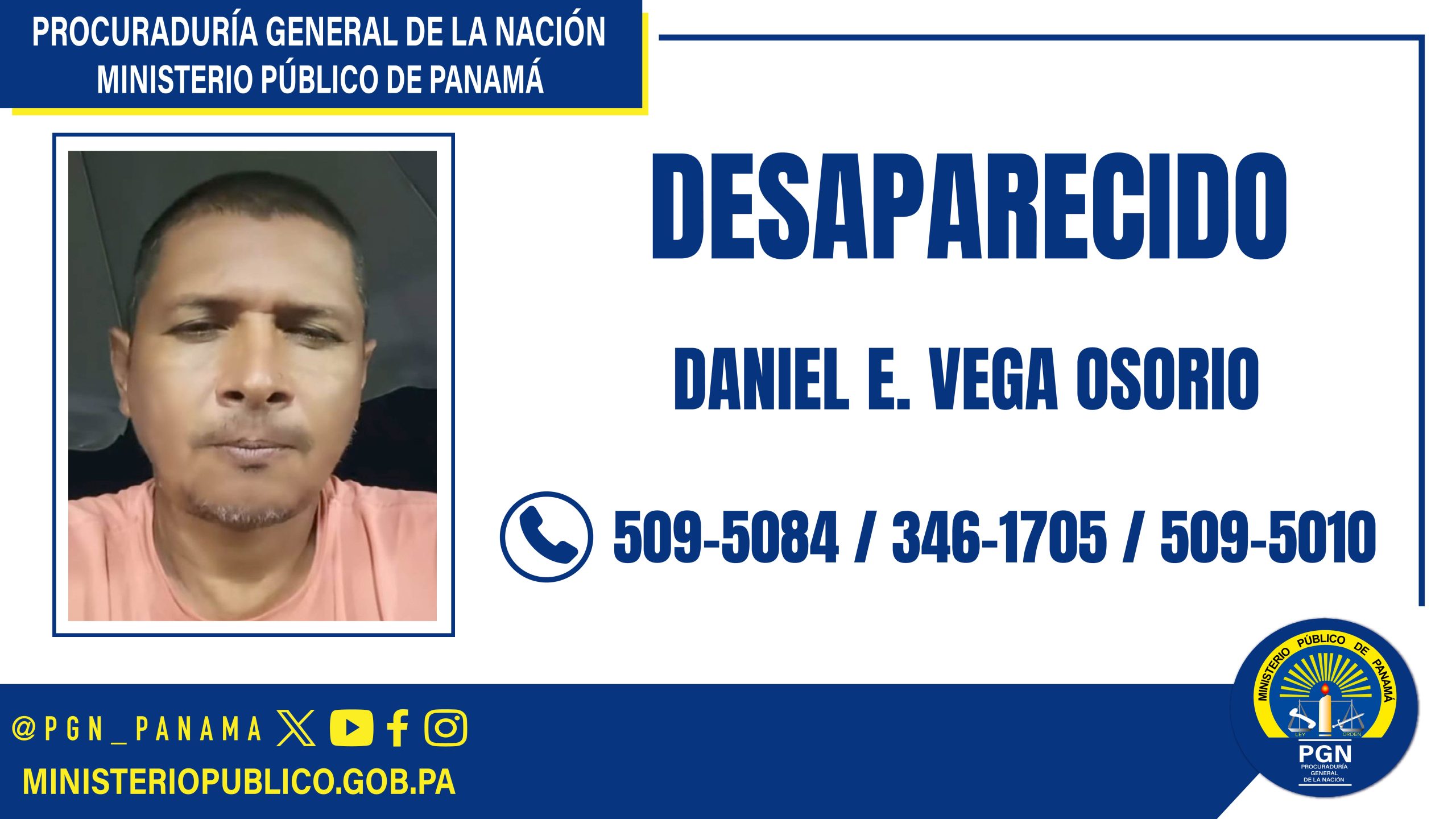 La Fiscalía Regional de Panamá Oeste, a través de la Sección de Atención Primaria de La Chorrera, adelanta una investigación por la supuesta comisión del delito contra la vida e integridad personal, en la modalidad de persona desaparecida, en perjuicio de Daniel Ernesto Osorio Vega de 52 años de edad.
