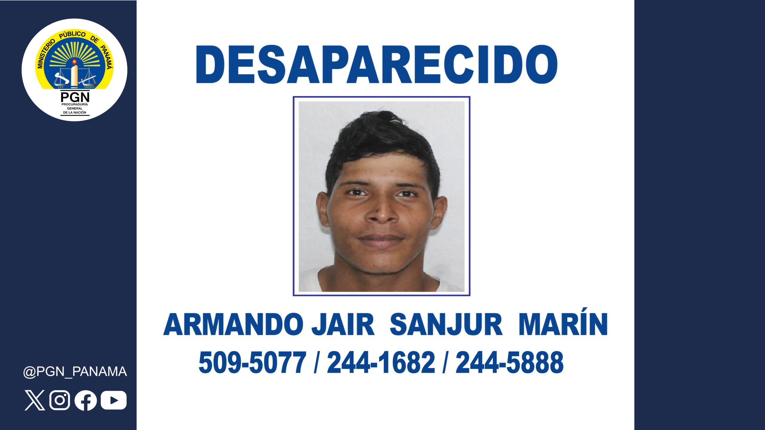 La Fiscalía Regional de Panamá Oeste, a través de la Sección de Homicidio y Femicidio, hace de conocimiento en general que instruye un sumario en averiguación por la supuesta comisión del delito Contra la Vida e Integridad Personal, en perjuicio de Armando Jair Sanjur, de 28 años de edad, quien se encuentra desaparecido desde el 31 de agosto de 2023.