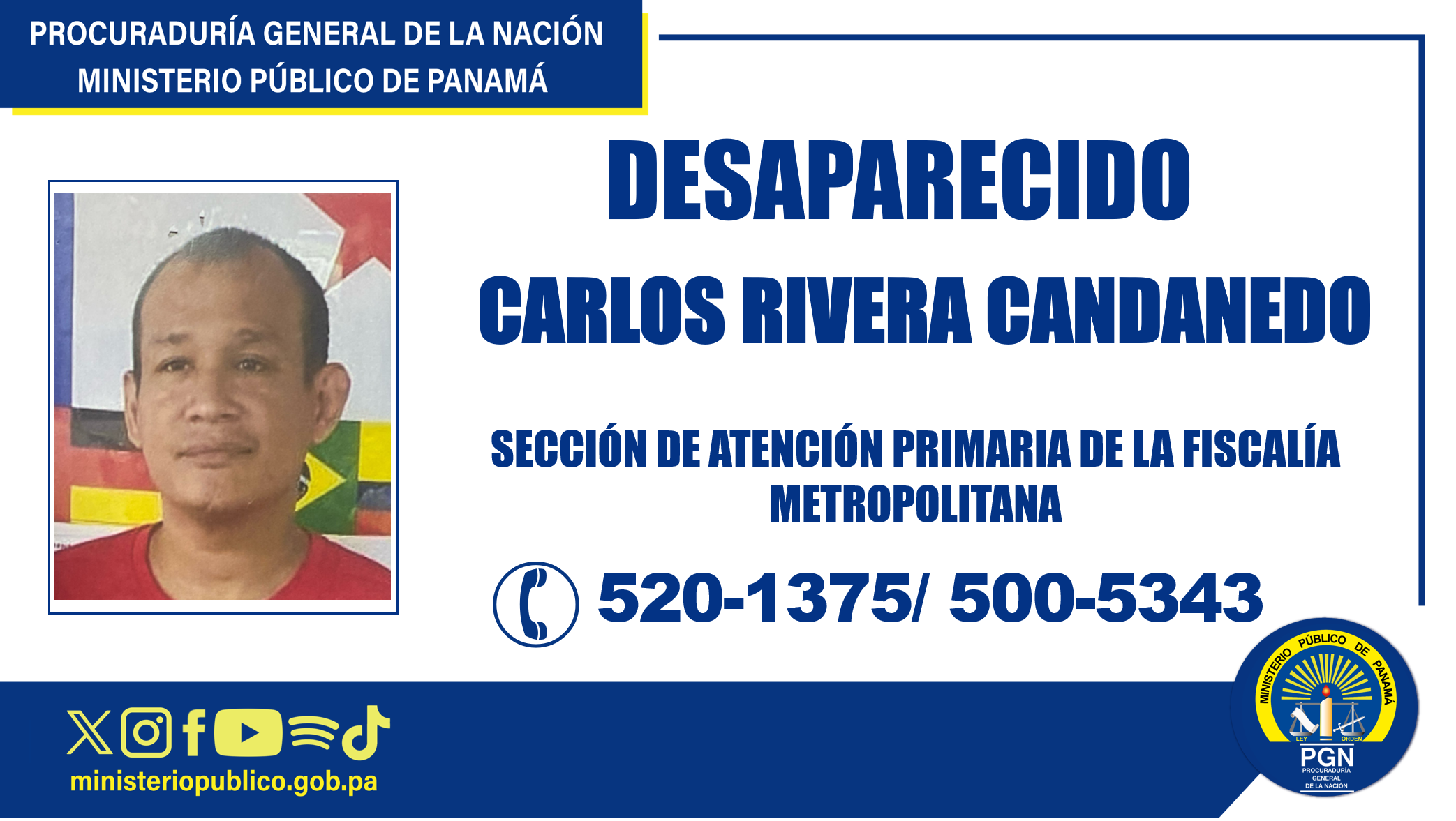 La Sección de Atención Primaria de la Séptima Subregional de las Mañanitas, Tocumen y la 24 de Diciembre de la Fiscalía Metropolitana instruye un sumario de investigación por la supuesta comisión del delito contra la libertad, en perjuicio de Carlos Iván Rivera Candanedo, portador de la cédula de identidad personal N° 4-742-2373, de 38 años de edad.