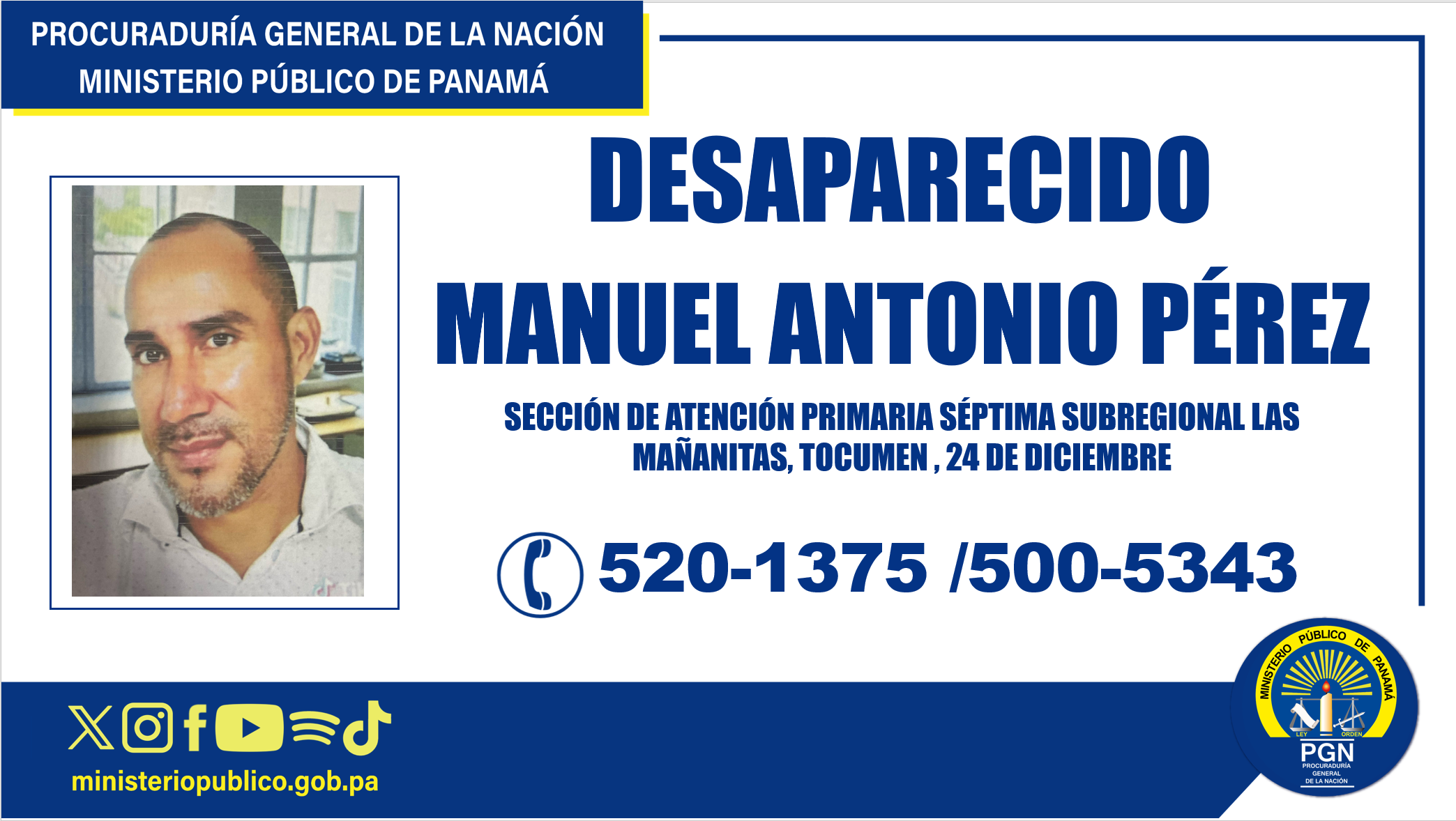 La Sección de Atención Primaria de la Séptima Subregional de Las Mañanitas – Tocumen – 24 de Diciembre de la Fiscalía Metropolitana instruye un sumario de investigación por la comisión del delito Contra la Libertad (Delitos Contra la Libertad Individual y Desaparición Forzada), por la desaparición de Manuel Antonio Pérez Pérez, portador de la cédula de identidad personal N° 8-793-567, de 40 años de edad.