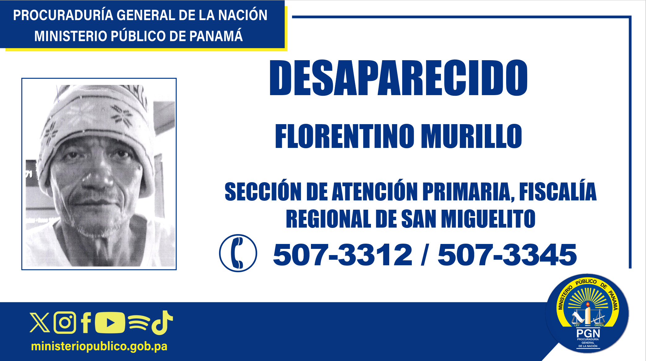 Se solicita a la ciudadanía que de tener conocimiento sobre el paradero del Florentino Murillo por favor comunicarse a los teléfonos 507-3312 / 507-3345 de la Sección de Atención Primaria de la Fiscalía Regional de San Miguelito, o a los teléfonos 524-2520 / 512-2511 de la Dirección de Investigación Judicial o al 511-9339 de la Dirección de Inteligencia Judicial.