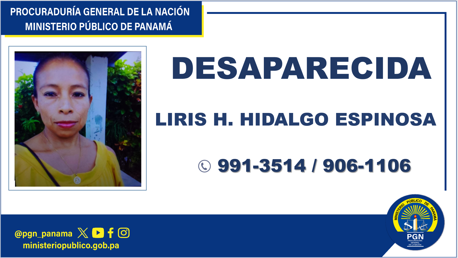 La Personería Municipal de Antón, hace de conocimiento en general que se instruye un sumario en averiguación por la supuesta comisión de delito contra la Vida e Integridad Personal, por la desaparición de Liris Haidee Hidalgo Espinosa, con cédula de identidad personal 2-712-871, de 42 años de edad quien se encuentra desaparecida desde el 1 de mayo de 2025.