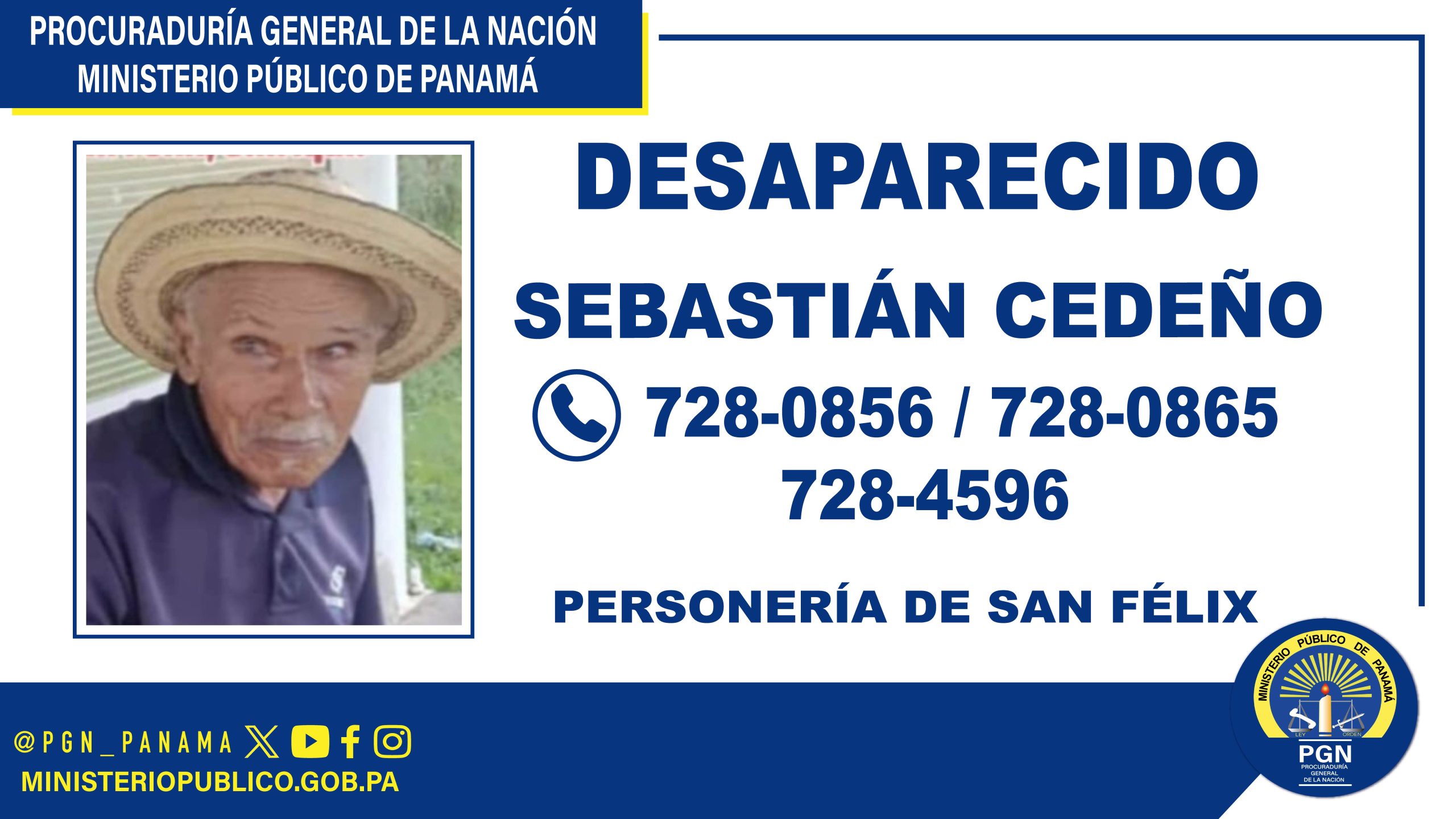 La Personería Municipal de San Félix, en la provincia de Chiriquí, inició investigación tras la desaparición del adulto mayor Sebastián Cedeño de 89 años, quien desde el pasado 23 de marzo del 2025, salió de su casa y desde entonces no se le ha visto.