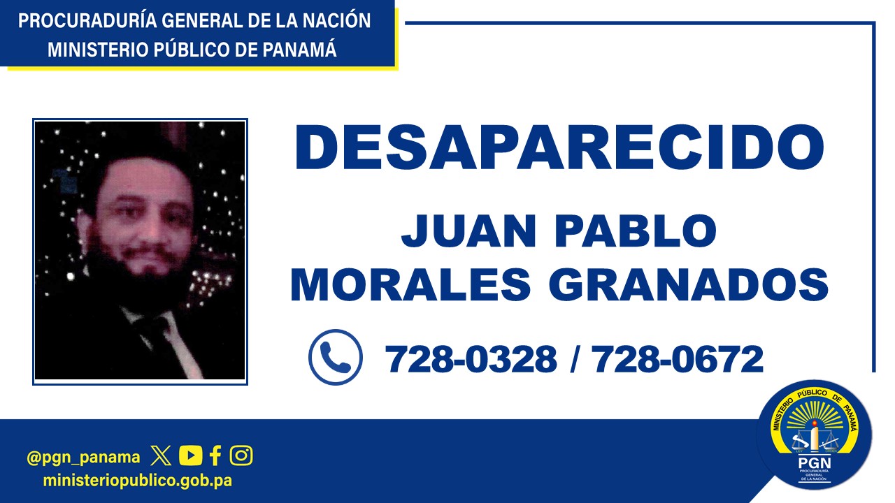 La Agencia Subregional de Bugaba, en la provincia de Chiriquí, mantiene investigación tras la desaparición del ciudadano Juan Pablo Morales Granado de 39 años, el cual fue visto por última vez, el 31 de julio del 2025.
