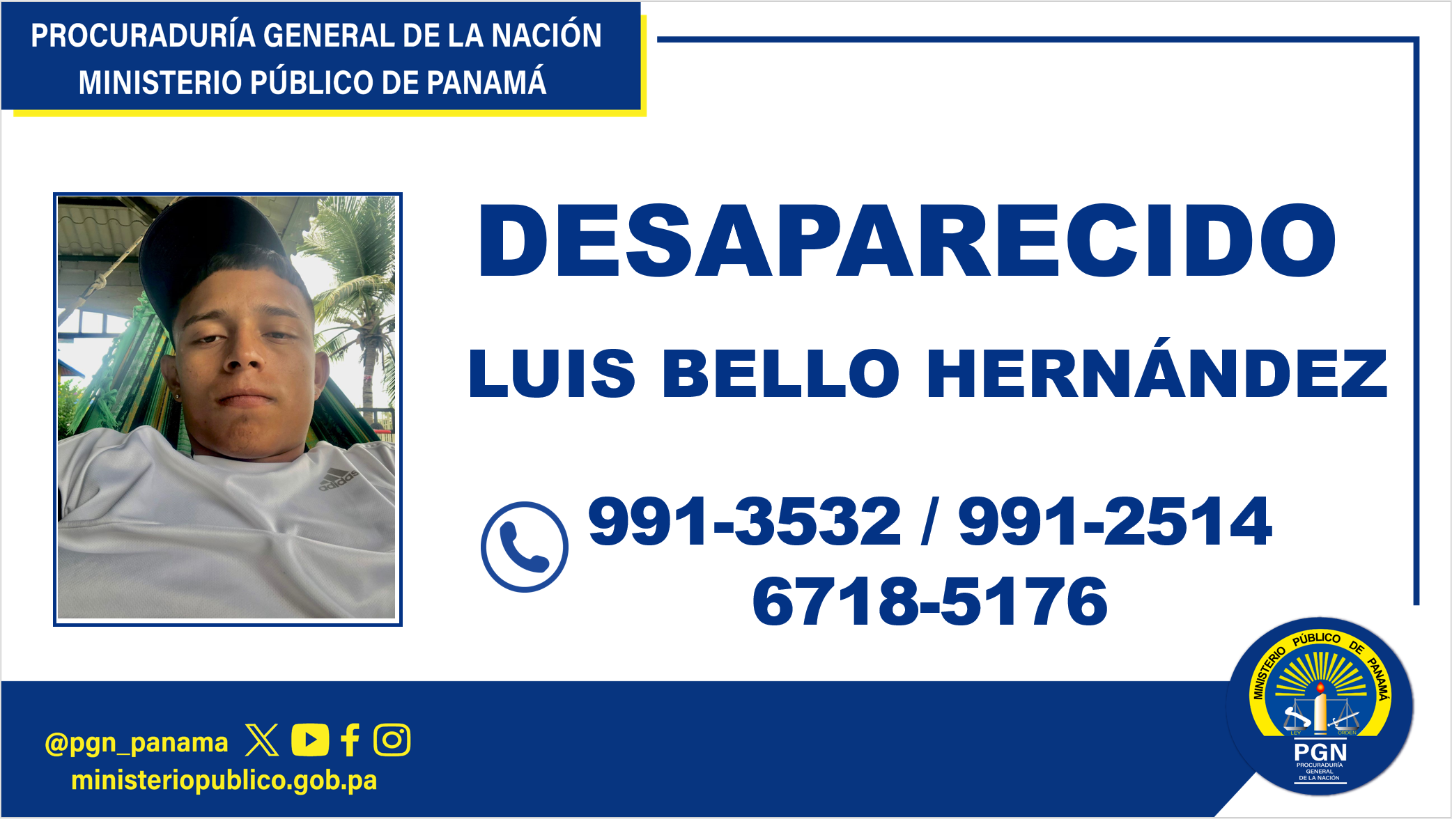 La Fiscalía Regional de Coclé, a través de la Sección de Atención Primaria, adelanta las investigaciones por el delito contra la Vida e Integridad Personal (persona desaparecida) en perjuicio de Luis Fernando Bello Hernández, con cédula de identidad 2-752-149, de 22 años de edad, quien fue vista por última vez el 17 de julio del 2025, a eso de las 4.00 p.m., cuando salía de su residencia, ubicada en Farallón corregimiento de Río Hato, distrito de Antón.
