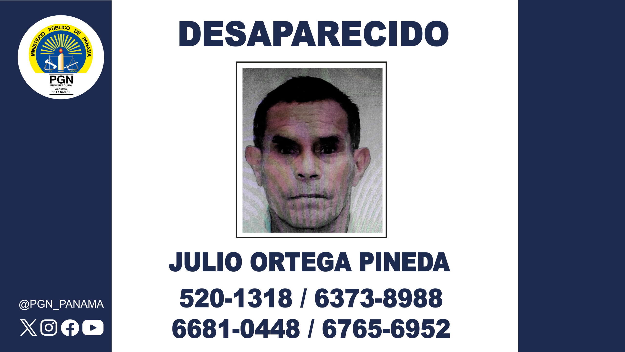 La Procuraduría General de la Nación, a través de la Sección de Atención Primaria de la Sexta Subregional de la Fiscalía Metropolitana, inició una investigación por la presunta comisión del delito contra la vida y la integridad personal, en perjuicio de JULIO ORTEGA PINEDA, de 64 años de edad, quien se encuentra desaparecido.