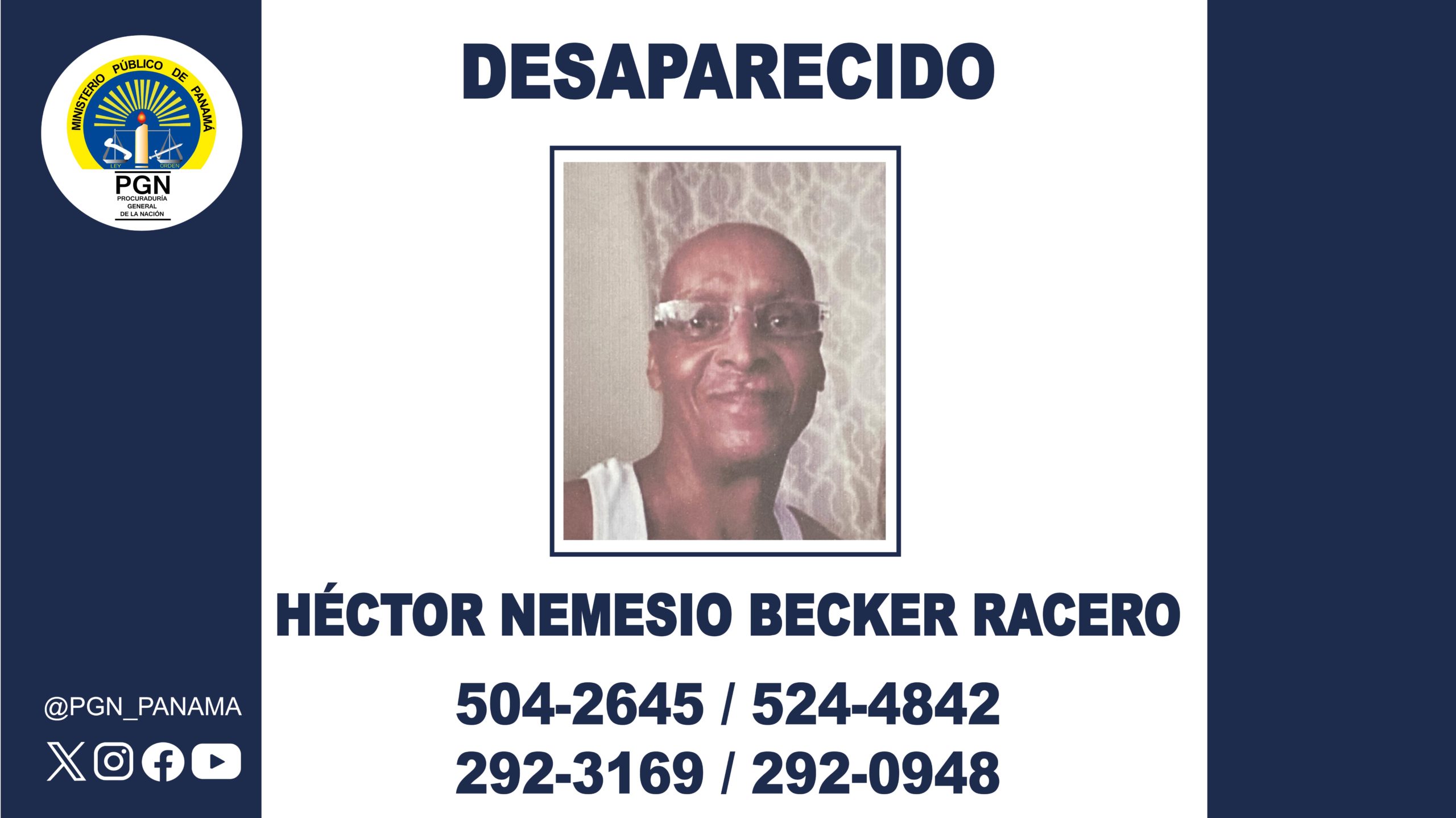 La Sección de Atención Primaria de la Séptima Subregional de Pedregal y Las Mañanitas de la Fiscalía Metropolitana solicita colaboración a la ciudadanía para dar con el paradero del señor Héctor Nemesio Becker Racero, de 60 años de edad, quien se mantiene desaparecido.