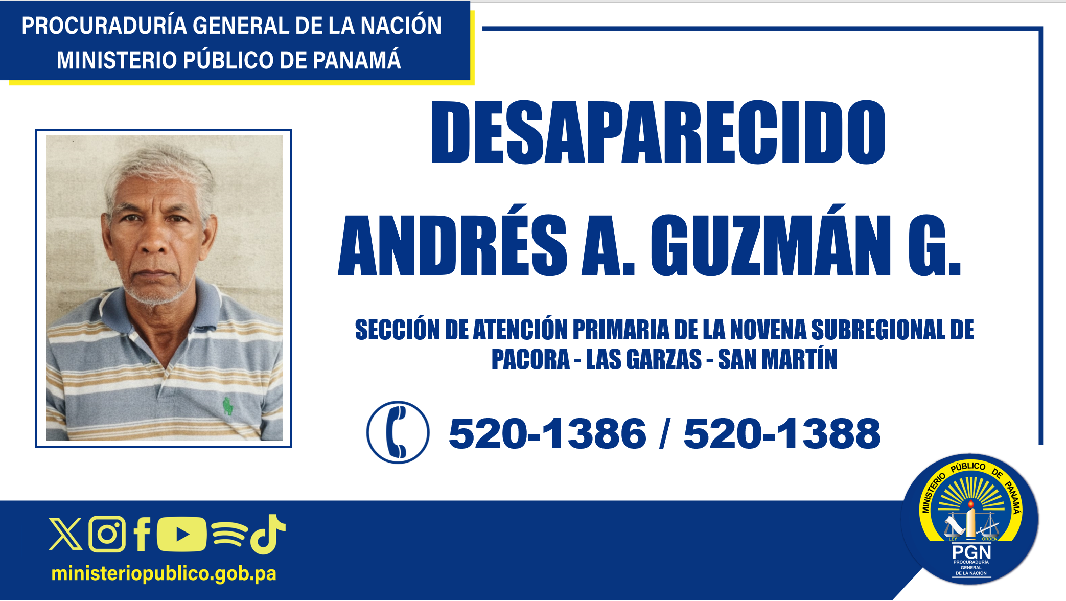 El Ministerio Público, a través de la Sección de Atención Primaria de la Novena Subregional de Pacora, Las Garzas y San Martín, solicita colaboración a la ciudadanía para localizar a Andrés Avelino Guzmán Guerra, con cedula de identidad personal N°8-211-478, de 71 años de edad, reportado como desaparecido desde el pasado 28 de agosto de 2025.