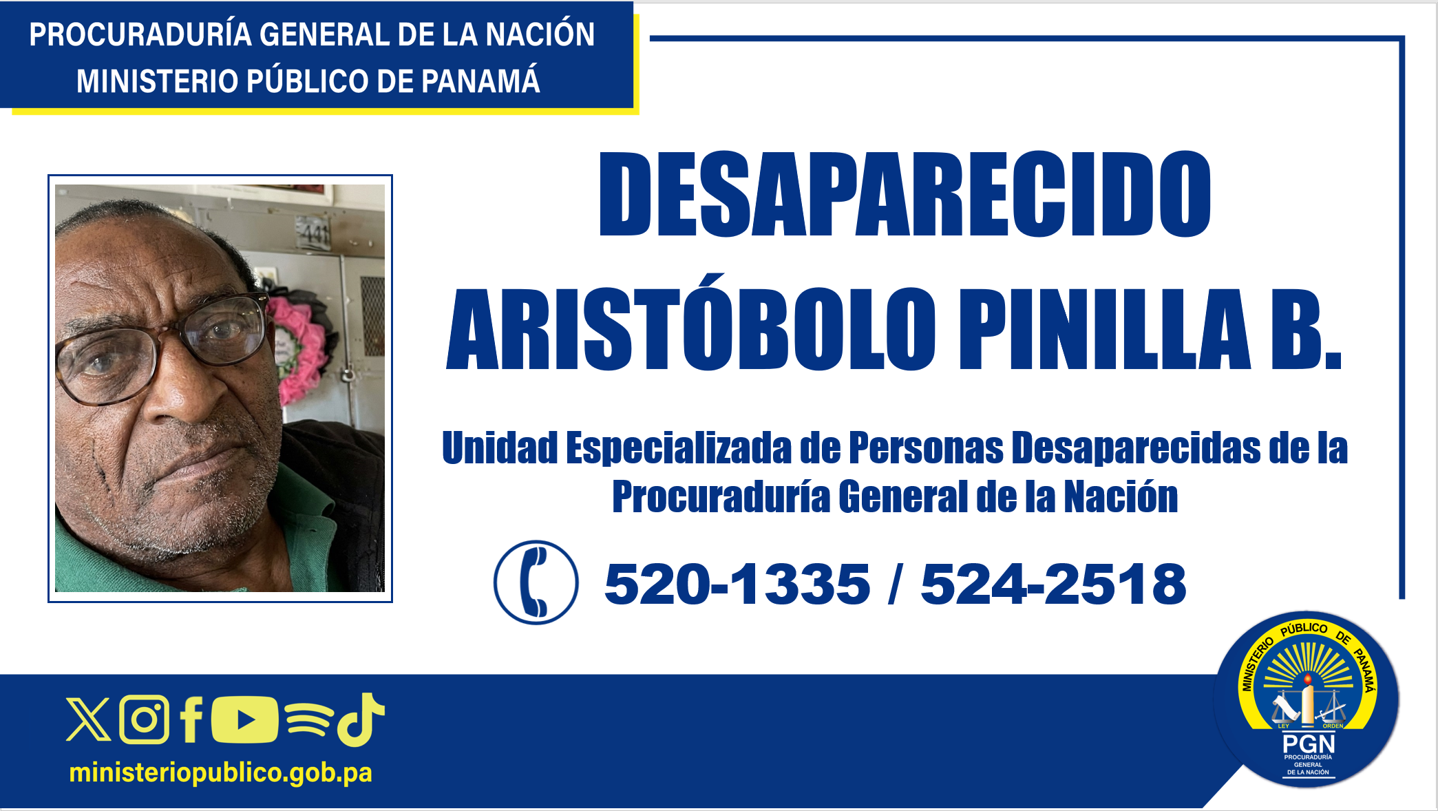 La Unidad Especializada de Personas Desaparecidas de la Procuraduría General de la Nación adelanta una investigación por la comisión del delito contra la vida e integridad personal (persona desaparecida) en perjuicio de Aristóbulo Enrique Pinilla Berrocal, con cédula 8-450-71, quien fue visto por última vez el 10 de octubre de 2025.