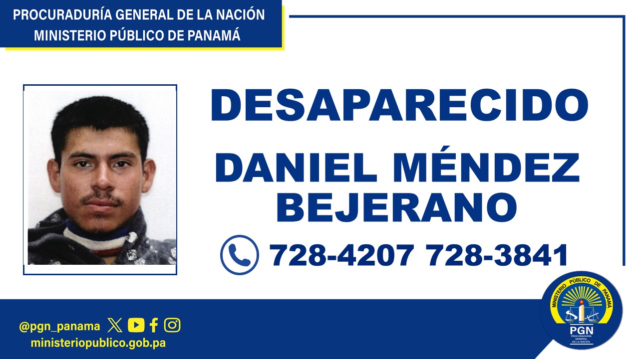 La Fiscalía Regional de Chiriquí, a través de la Sección de Delitos contra la Vida y la Integridad Personal y Delitos contra la Libertad, mantiene una investigación por la desaparición del ciudadano Daniel Méndez Bejerano, de 20 años, cédula 4-838-90.