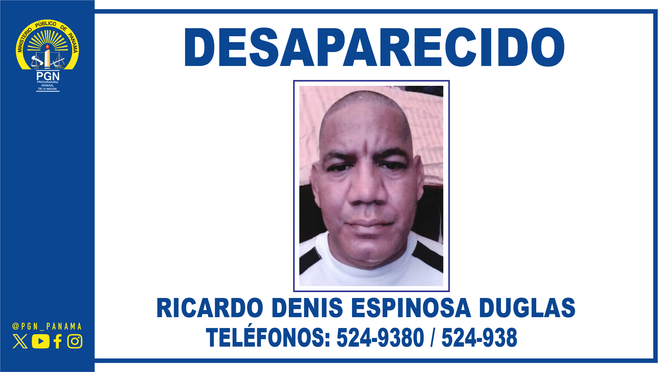 La Sección de Atención Primaria Cuarta Subregional de la Fiscalía Metropolitana requiere la colaboración ciudadana para dar con el paradero del ciudadano Ricardo Denis Espinosa Duglas, de 49 años de edad, hecho ocurrido el 2 de septiembre de 2023.