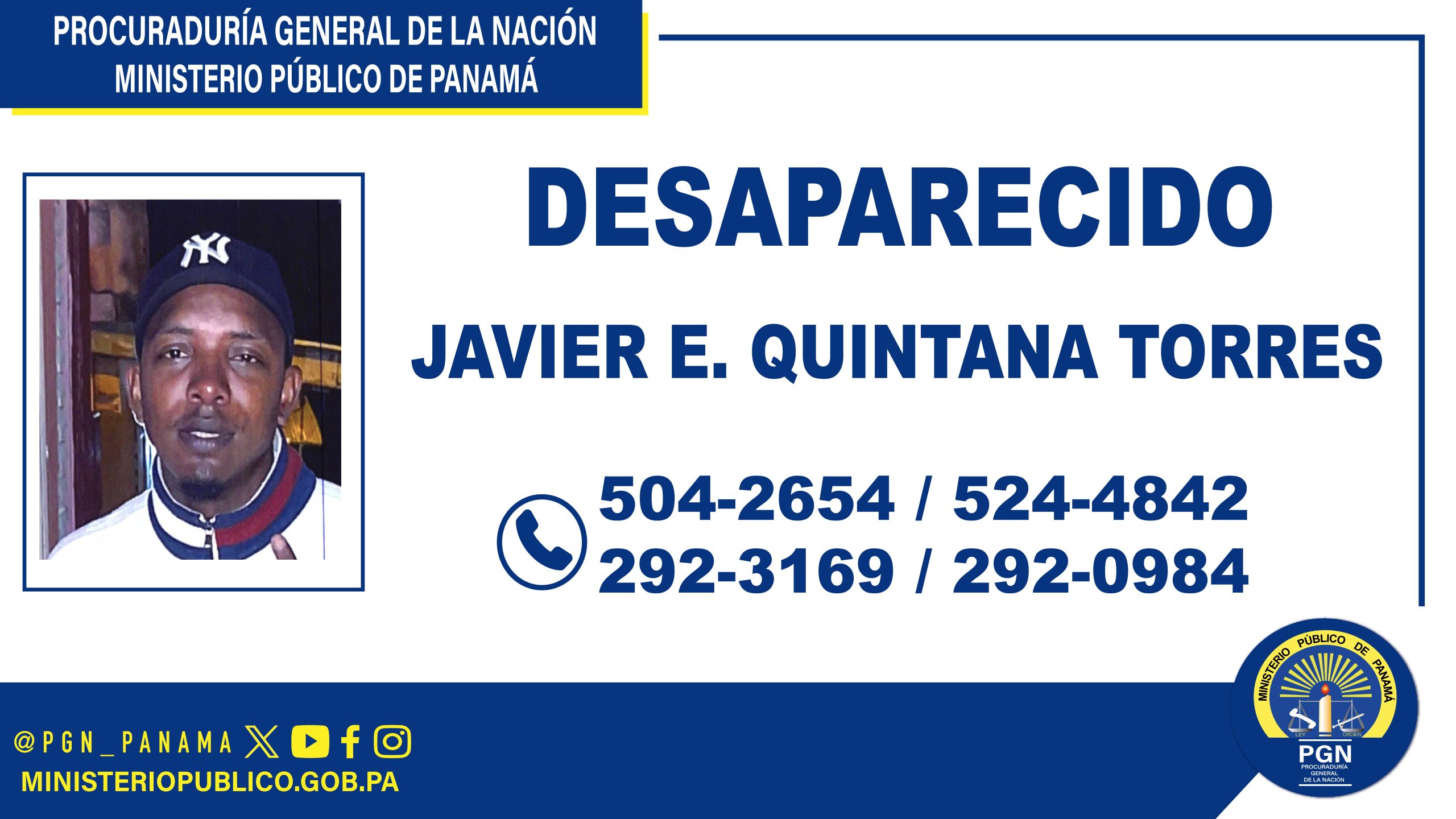 La Sección de Atención Primaria de la Séptima Subregional (Pedregal – Las Mañanitas), inició una investigación por la presunta comisión del delito contra la vida y la integridad personal, en perjuicio de JAVIER EDIEL QUINTANA TORRES, de 37 años de edad, con cédula de identidad personal No. 8-811-113, quien se encuentra desaparecido desde el 8 de marzo de 2025.