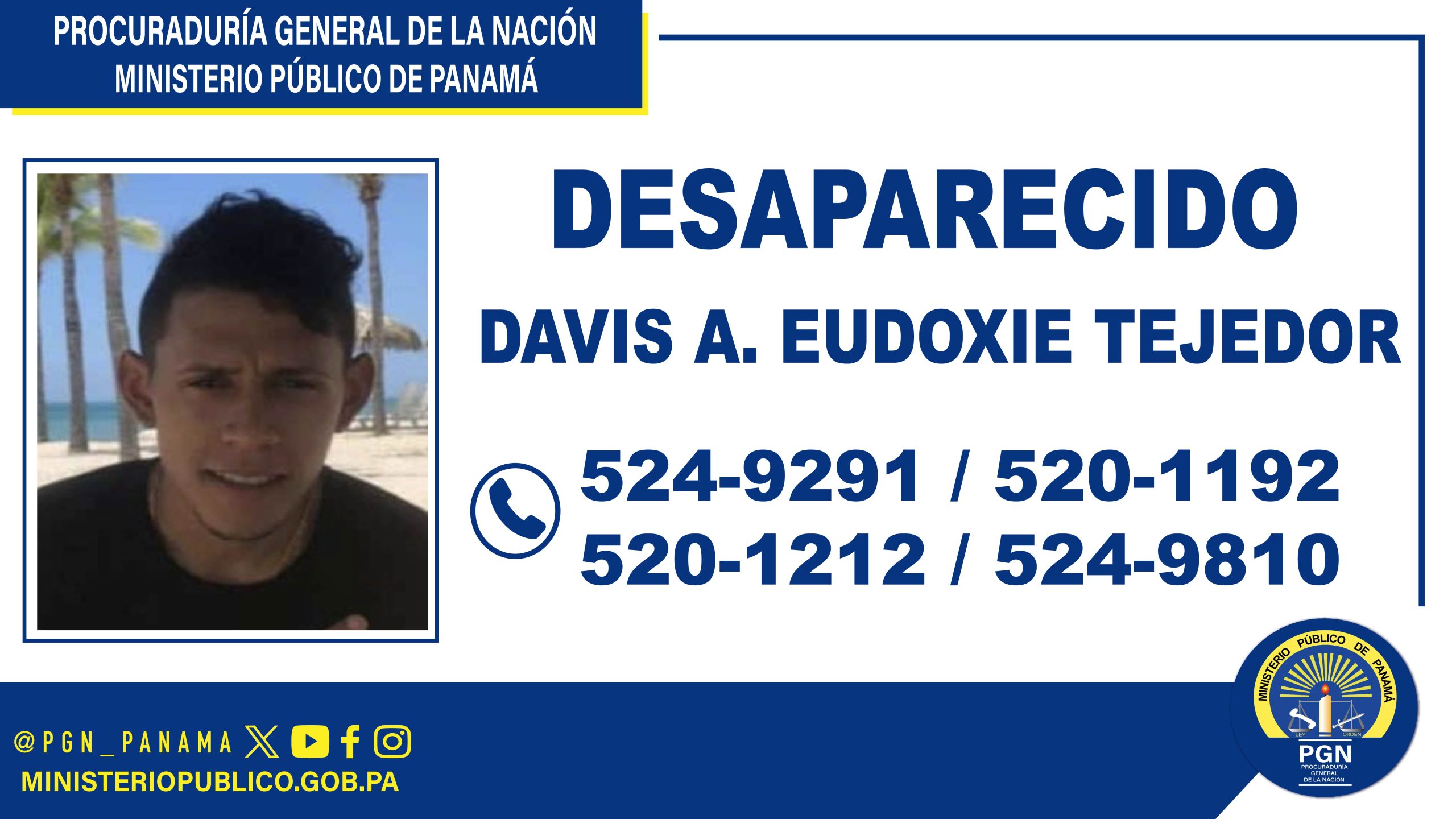 La Sección de Atención Primaria de la Quinta Subregional de la Fiscalía Metropolitana, inició una investigación por la presunta comisión del delito contra la vida y la integridad personal, en perjuicio de DAVIS ANTONIO EUDOXIE TEJEDOR, de 26 años de edad, con cédula de identidad personal No. 8-921-263, quien se encuentra desaparecido desde el 11 de marzo de 2025.