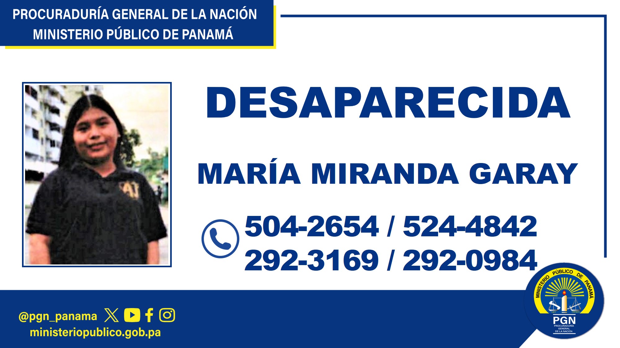 La Procuraduría General de la Nación, a través de la Sección de Atención Primaria, Séptima Subregional, inició una investigación por la presunta comisión del delito contra la Vida y la Integridad Personal, en perjuicio de María Carolina Miranda Garay con cédula de identidad personal 4-839-395, quien se encuentra desaparecida desde el 7 de abril 2025, cuando salió de su residencia ubicada en el sector de Los Pinos, corregimiento de Las Mañanitas.