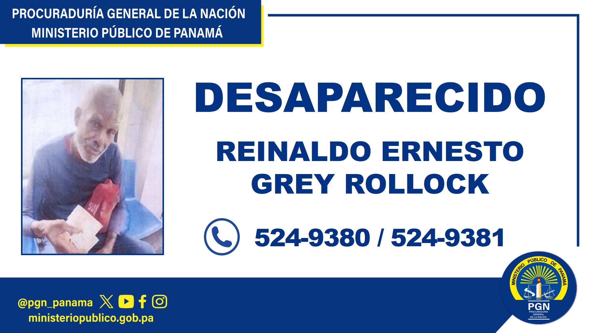 La Sección de Atención Primaria Cuarta Subregional de la Fiscalía Metropolitana, inició una investigación por la presunta comisión del delito contra la vida y la integridad personal, en la modalidad de delitos contra la libertad individual, en perjuicio de Reinaldo Ernesto Grey Rollock, con cedula de identidad personal No 8-289-837, de 74 años de edad, quien se encuentra desaparecido desde el 25 de mayo de 2025.