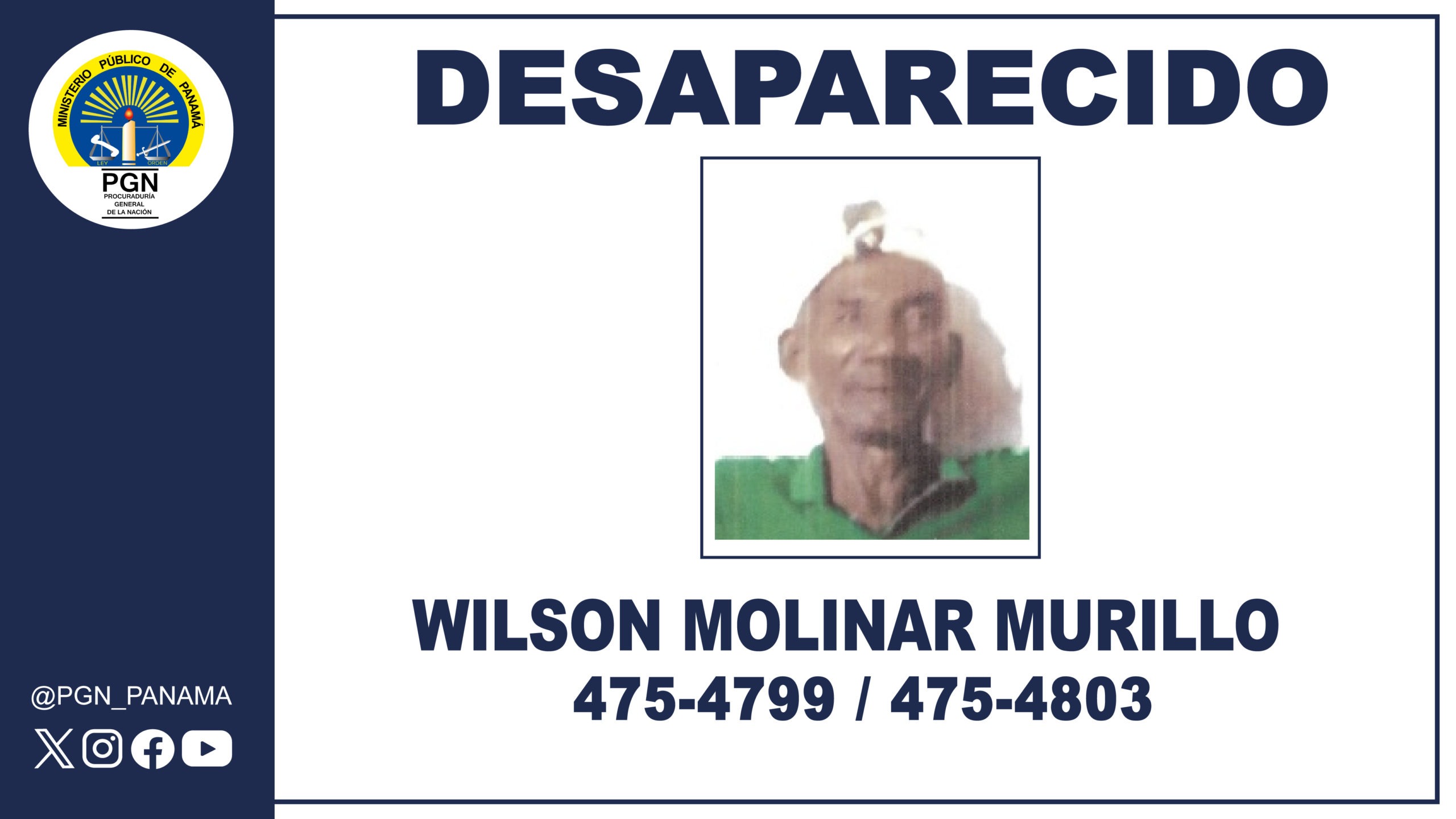 La Fiscalía Regional de Colón y Guna Yala, a través de la Sección de Atención Primaria mantiene una investigación por la presunta comisión de delito contra la vida y la integridad personal, por la desaparición del ciudadano de 78 años de edad, Wilson Molinar Murillo, quien se encuentra desaparecido desde el 10 de abril del 2024.