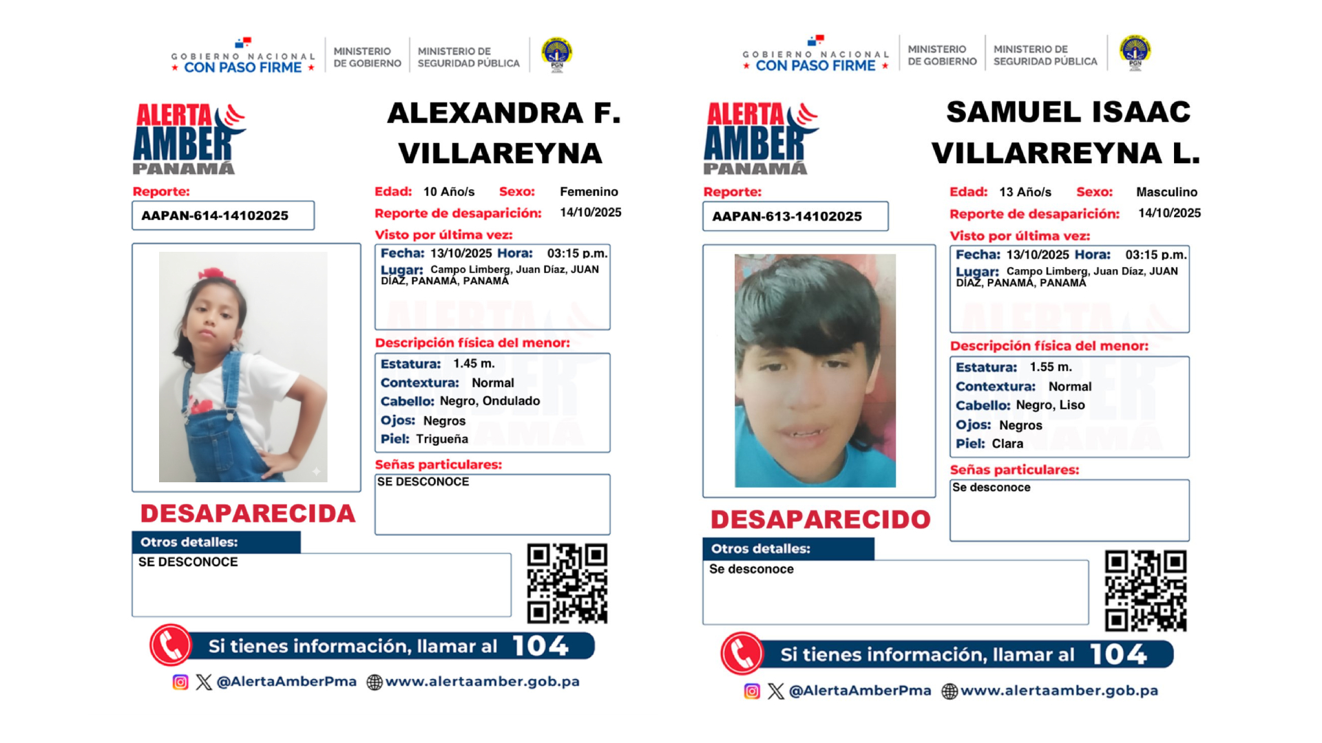 La Fiscalía Metropolitana, por medio de la Sección de Atención Primaria, Sexta Subregional de Juan Díaz, Don Bosco y Pedregal, solicita la colaboración de la ciudadanía para dar con el paradero de los menores de edad SAMUEL ISAAC VILLAREYNA, de 15 años de edad y ALEXANDRA FAVIOLA VILLAREYNA, de 10 años de edad, denunciados como desaparecidos mediante Alerta Amber por la Secretaría Nacional de Niñez, Adolescencia y Familia (SENNIAF) el 13 de octubre de 2025.