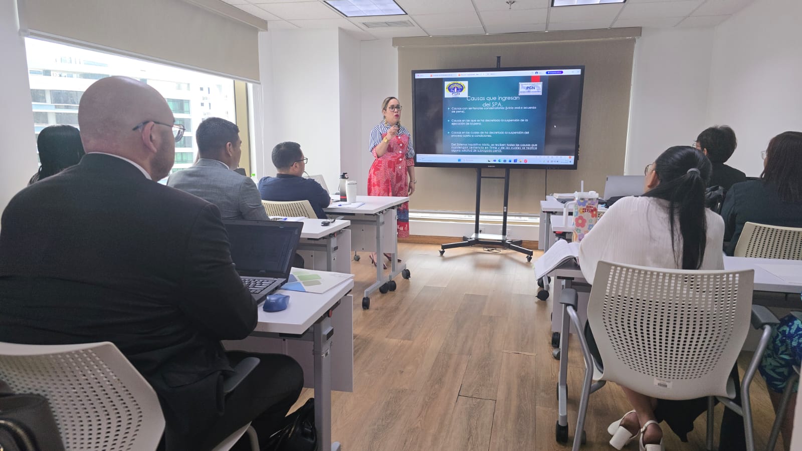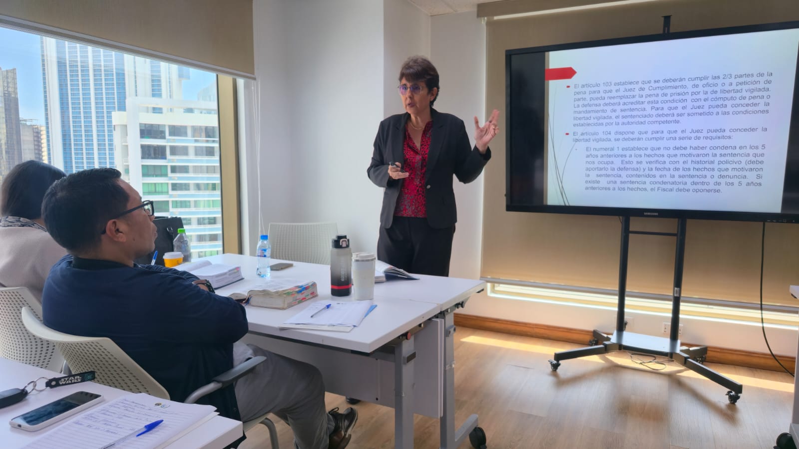 Posteriormente, la Fiscal de Circuito Otilia González abordó temas clave como la suspensión condicional de la ejecución de la pena y el reemplazo de penas cortas por días-multa, arresto de fines de semana, reprensión pública o privada y trabajo comunitario, de acuerdo con los parámetros establecidos en la normativa penal vigente. En la jornada de media mañana, también se profundizó en las penas sustitutivas, particularmente la prisión domiciliaria, el control y verificación de su cumplimiento, así como el aplazamiento y sustitución de la ejecución de la pena principal.