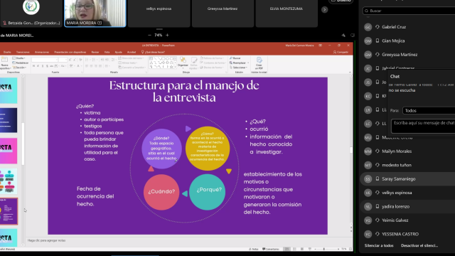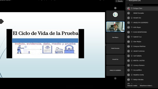 La fiscal María Moreira lideró el módulo sobre técnicas de entrevista, y su taller resaltando su valor como herramienta científica para precisar los detalles del hecho (qué, quién, cómo, cuándo y dónde). Complementando esta visión, el fiscal Enrique Chen analizó la importancia crítica de los elementos de prueba y su correcto manejo dentro de la fase investigativa.