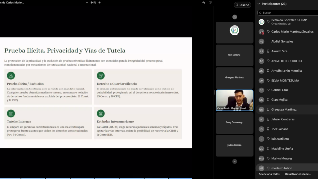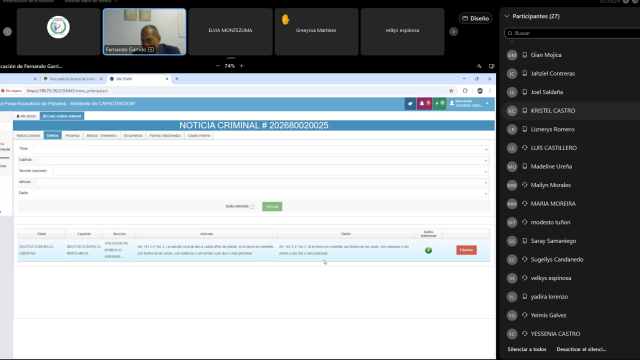 Por su parte, la fiscal Itziar Martínez profundizó en las actuaciones iniciales, definiéndolas como las diligencias urgentes para verificar la veracidad de los hechos e individualizar a los responsables. En el ámbito tecnológico, el Ingeniero Fernando Garrido instruyó a los participantes en el manejo práctico de la Plataforma del Sistema Penal Acusatorio (SPA) bajo un entorno de modo de prueba.