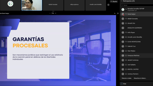 La jornada académica inició con la intervención de la fiscal Gina Díaz, quien sentó las bases conceptuales sobre el Derecho Penal y la configuración del delito. Posteriormente, la fiscal Darla Sanjur desglosó el desarrollo del proceso penal, explicando la secuencia de etapas para la determinación de responsabilidades y aplicación de sanciones, enfatizando en los principios, garantías y roles de los sujetos procesales.