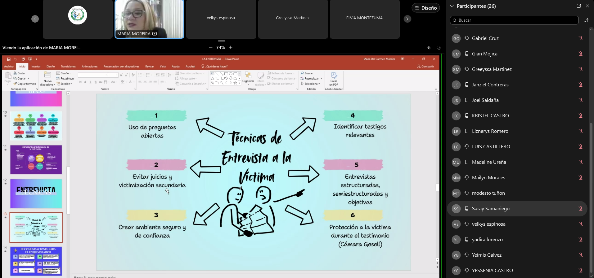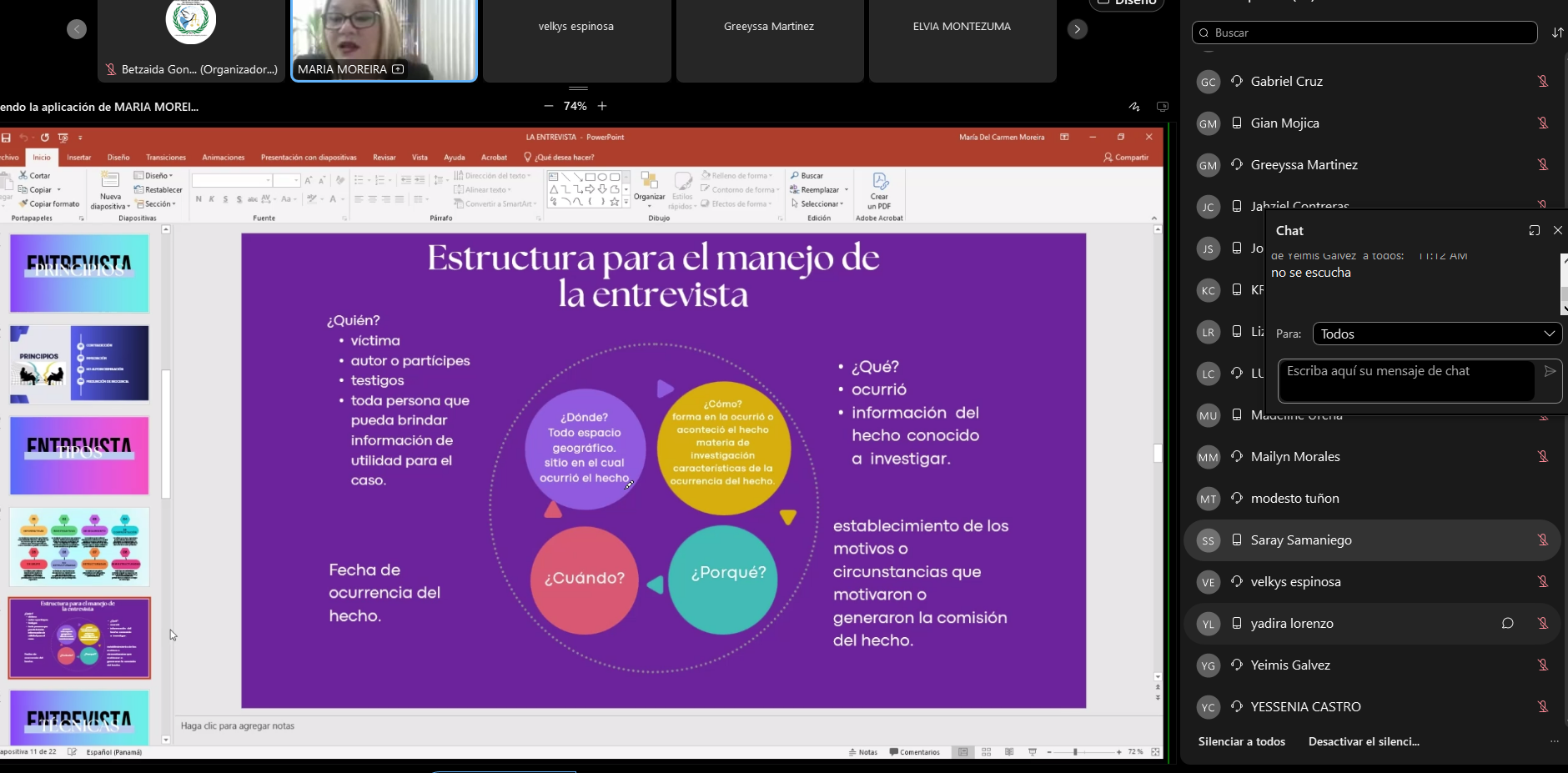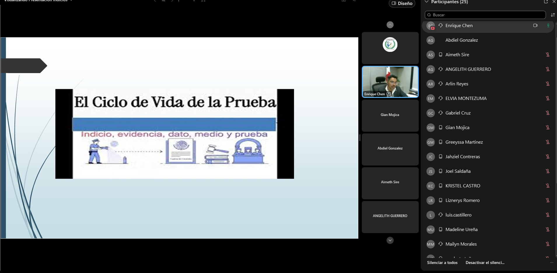 La fiscal María Moreira lideró el módulo sobre técnicas de entrevista, y su taller resaltando su valor como herramienta científica para precisar los detalles del hecho (qué, quién, cómo, cuándo y dónde). Complementando esta visión, el fiscal Enrique Chen analizó la importancia crítica de los elementos de prueba y su correcto manejo dentro de la fase investigativa.