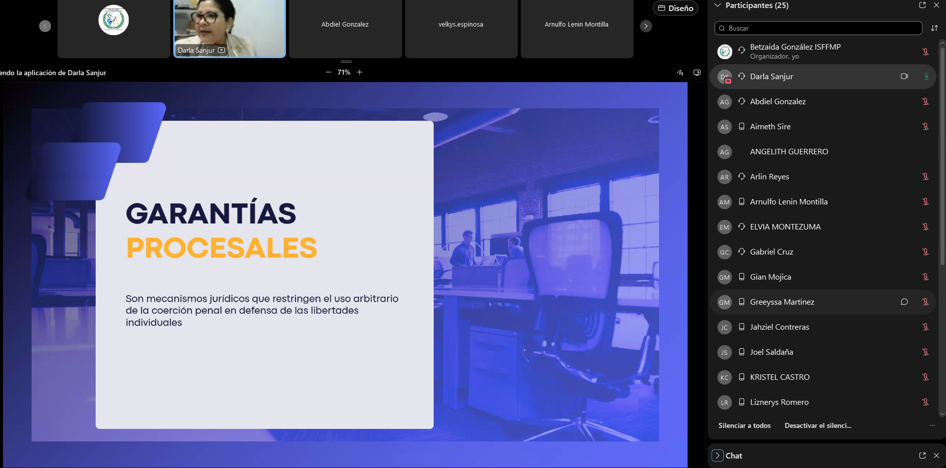 La jornada académica inició con la intervención de la fiscal Gina Díaz, quien sentó las bases conceptuales sobre el Derecho Penal y la configuración del delito. Posteriormente, la fiscal Darla Sanjur desglosó el desarrollo del proceso penal, explicando la secuencia de etapas para la determinación de responsabilidades y aplicación de sanciones, enfatizando en los principios, garantías y roles de los sujetos procesales.