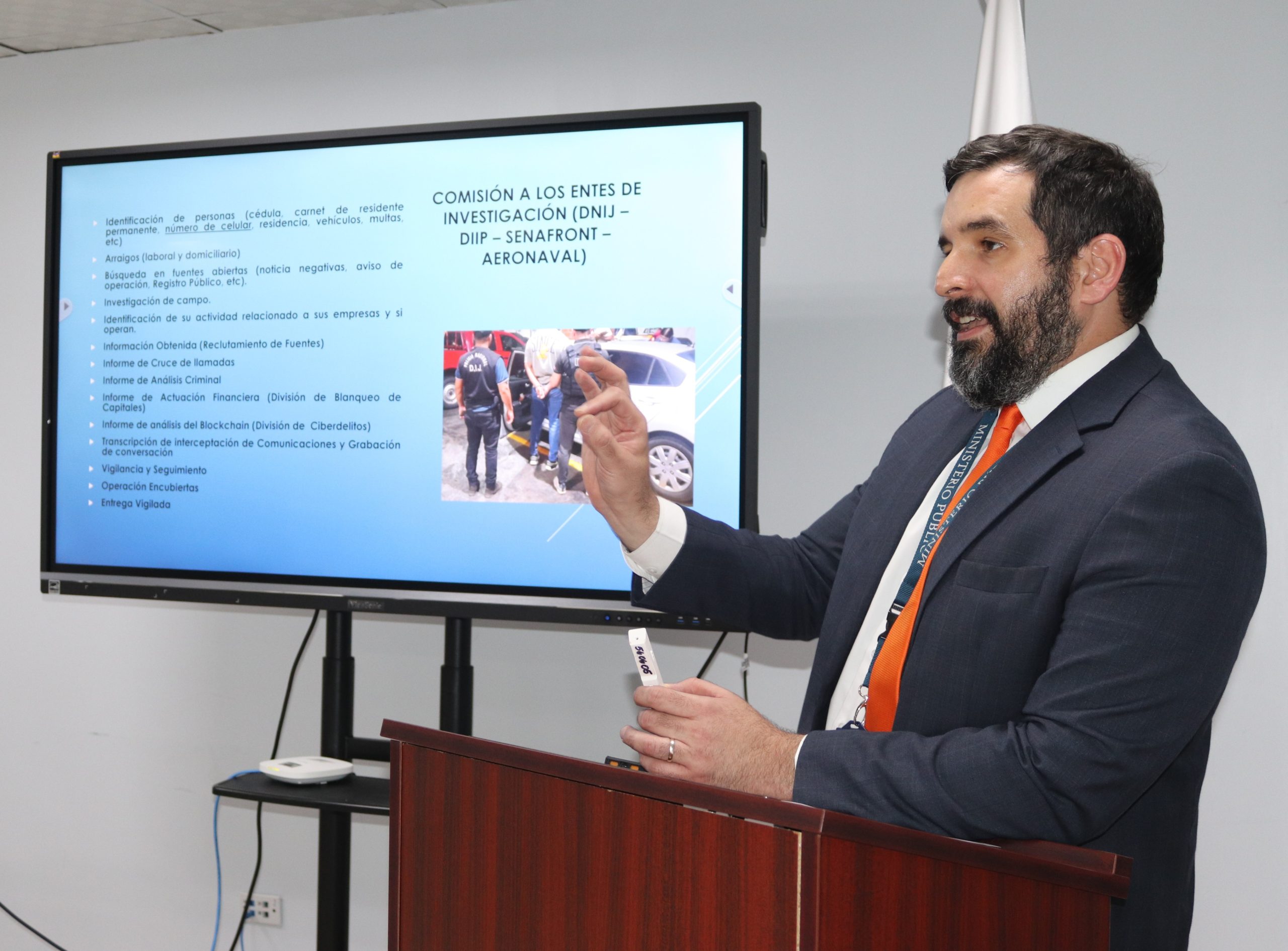 Entre los expositores participaron el licenciado Jorge Villalba, analista financiero de la Fuerza de Tarea Conjunta contra el Blanqueo de Capitales; la licenciada Dalys Ortega, de la Unidad Especializada en Delitos de Blanqueo de Capitales; los licenciados Marco Mosquera y Eduardo Rivera, de la Fiscalía Segunda Especializada contra la Delincuencia Organizada; la licenciada Sandy Cedeño, fiscal de circuito de la Fiscalía Segunda Especializada contra la Delincuencia Organizada; y el licenciado Gilberto Arona, fiscal de circuito de la Fiscalía Primera Especializada contra la Delincuencia Organizada.