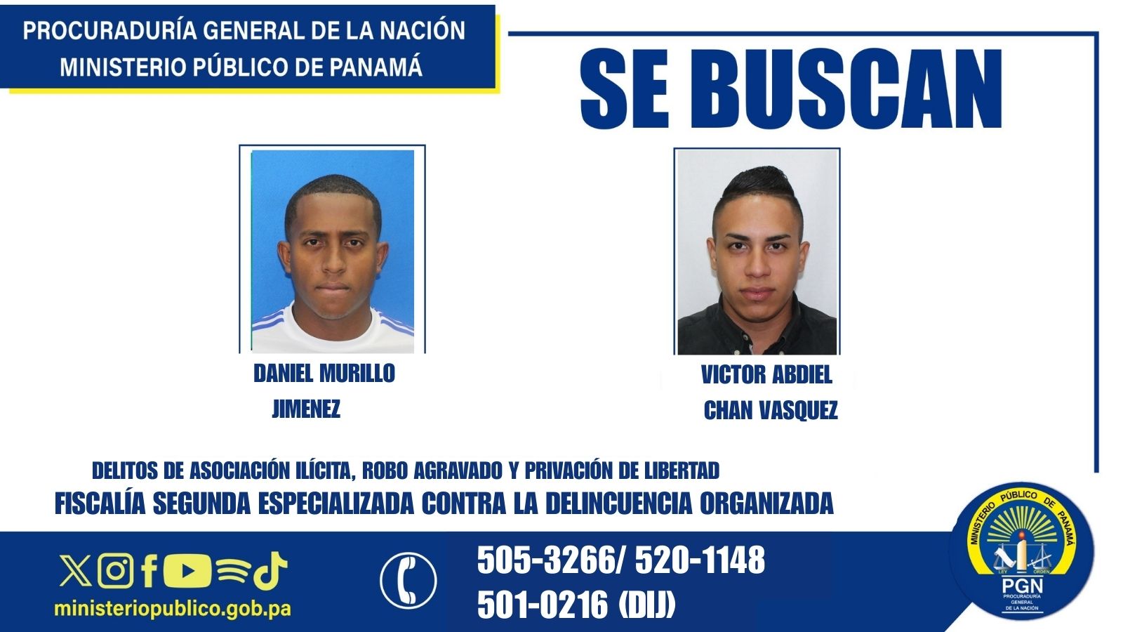 La Fiscalía Segunda Especializada contra la Delincuencia Organizada, solicita la colaboración de la ciudadanía para dar con la ubicación de los ciudadanos Víctor Abdiel Chan Vásquez con cédula 8-889-2037 y Daniel Murillo Jiménez con cédula PE-15-435, requeridos dentro de investigación que adelanta este despacho.