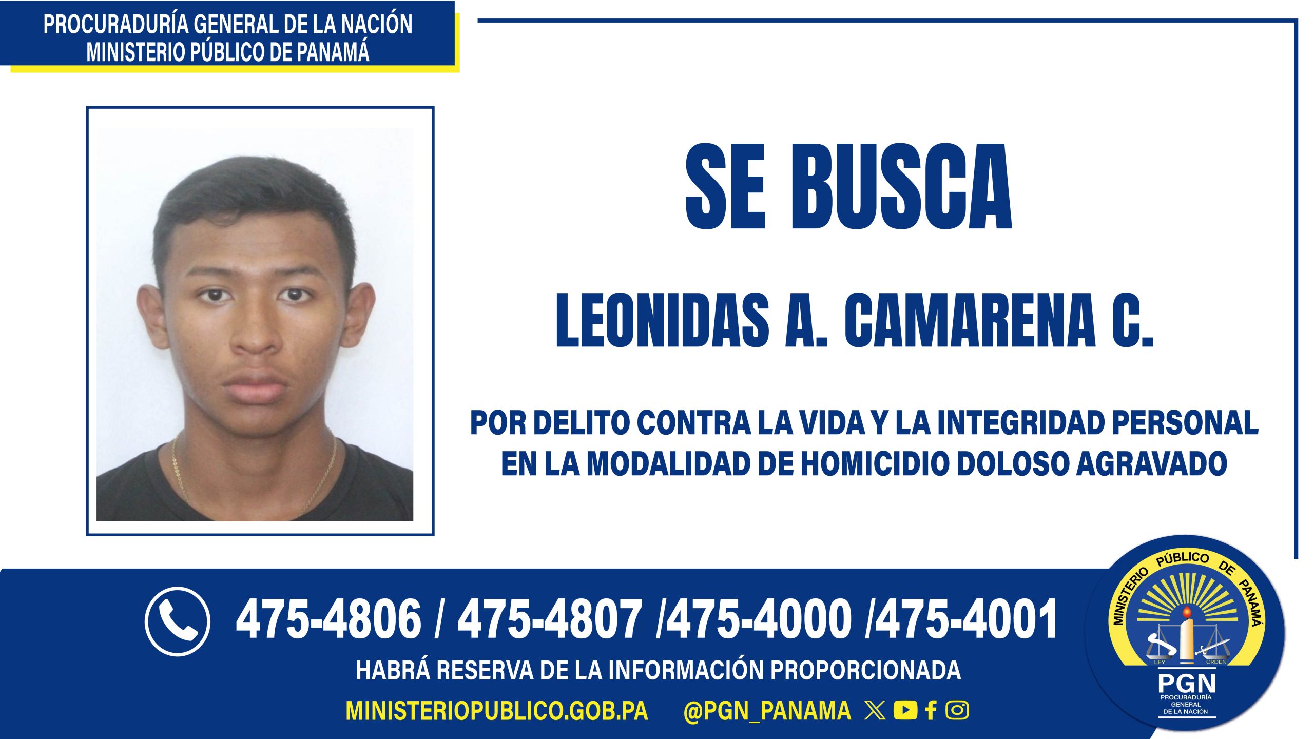 La Sección Especializada en Homicidio y Femicidio de la Fiscalía Regional de Colón y Guna Yala, solicita la colaboración de la ciudadanía para dar con la ubicación del ciudadano Leonidas Alexis Camarena Camaño con cédula No. 4-819-1528, toda vez que sobre él se ha emitido una orden de aprehensión.