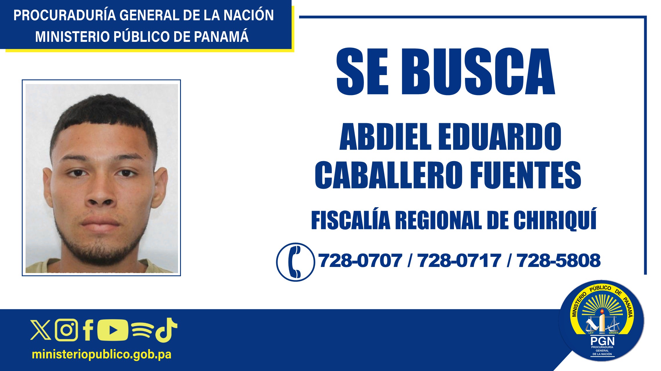 La Fiscalía Regional de Chiriquí, a través de la Personería de Alanje, pide colaboración, para dar con la ubicación del ciudadano Abdiel Eduardo Caballero Fuentes, con cédula de identidad personal 4-810-190, de 26 años de edad.