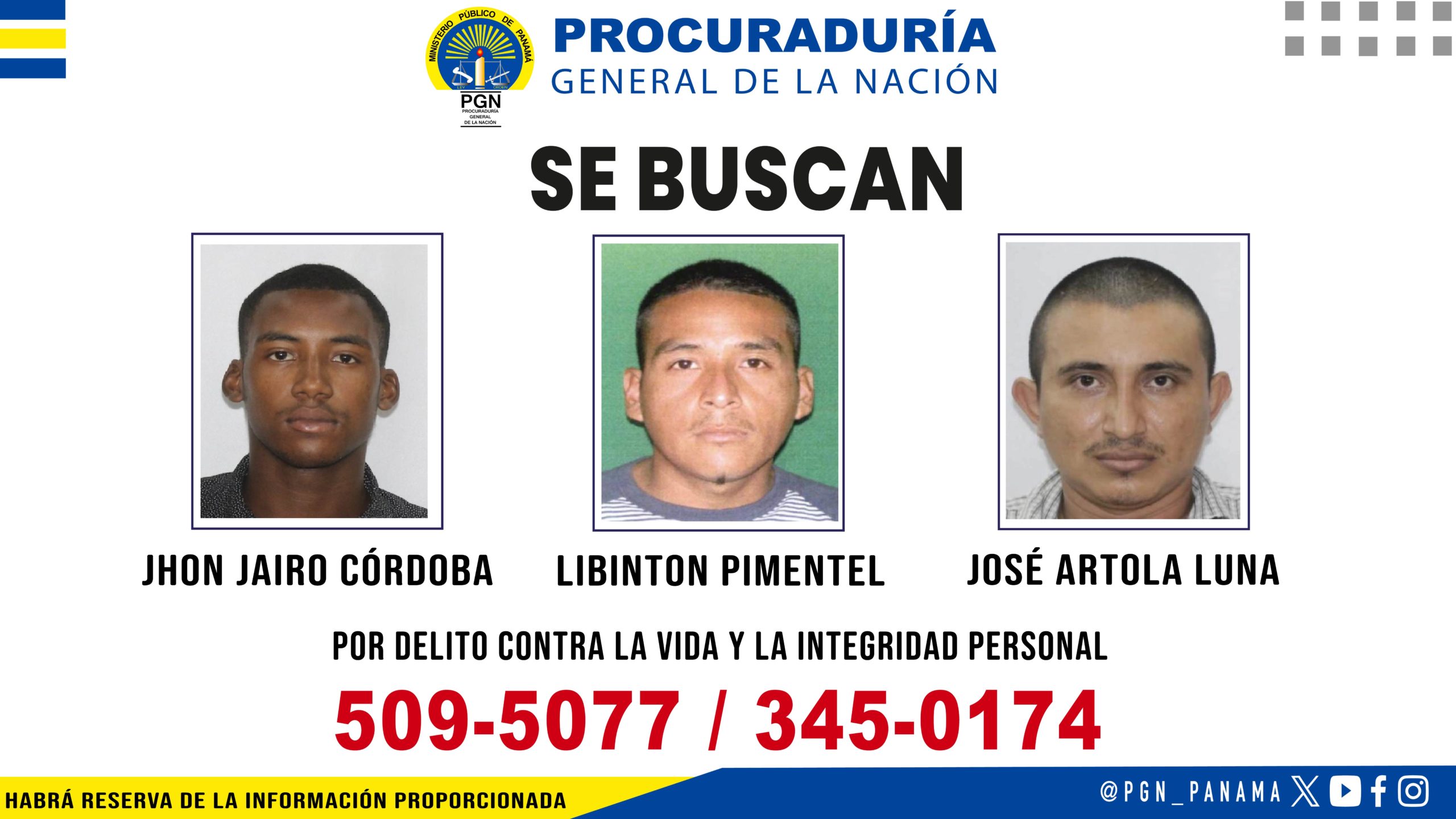 La Sección Especializada en Homicidio y Femicidio de la Fiscalía Regional de Panamá Oeste, reitera la solicitud de apoyo a la ciudadanía para dar con el paradero de John Jairo Córdoba, Libinton Pimentel Mendoza y José Santos Artola Luna, vinculados a diversas investigaciones que se adelantan por la comisión de delitos contra la vida y la integridad personal.