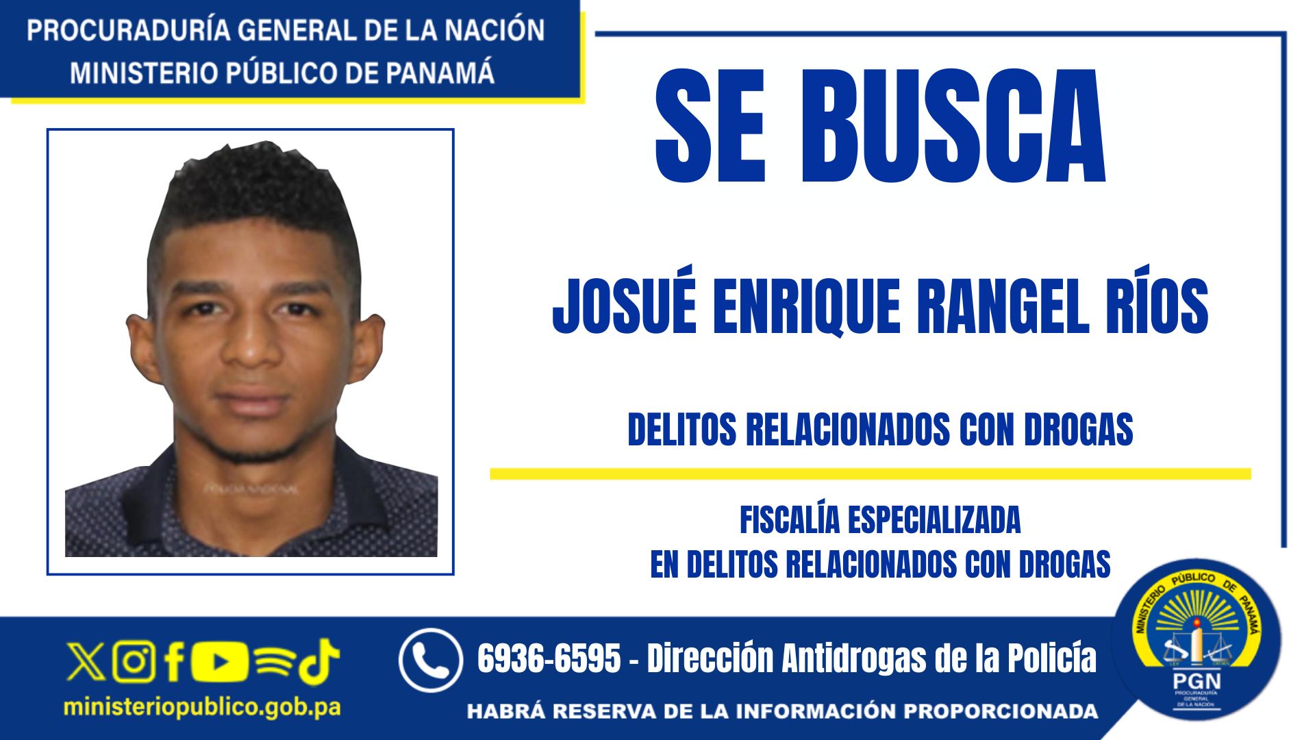 La Procuraduría General de la Nación, a través de la Fiscalía Superior Especializada en Delitos Relacionados con Drogas de Panamá, solicita la colaboración de la ciudadanía para dar con la ubicación del ciudadano Josué Enrique Rangel Ríos, con cédula de identidad personal 8-969-1911, toda vez que sobre él se ha emitido una orden de aprehensión que data de diciembre de 2024.
